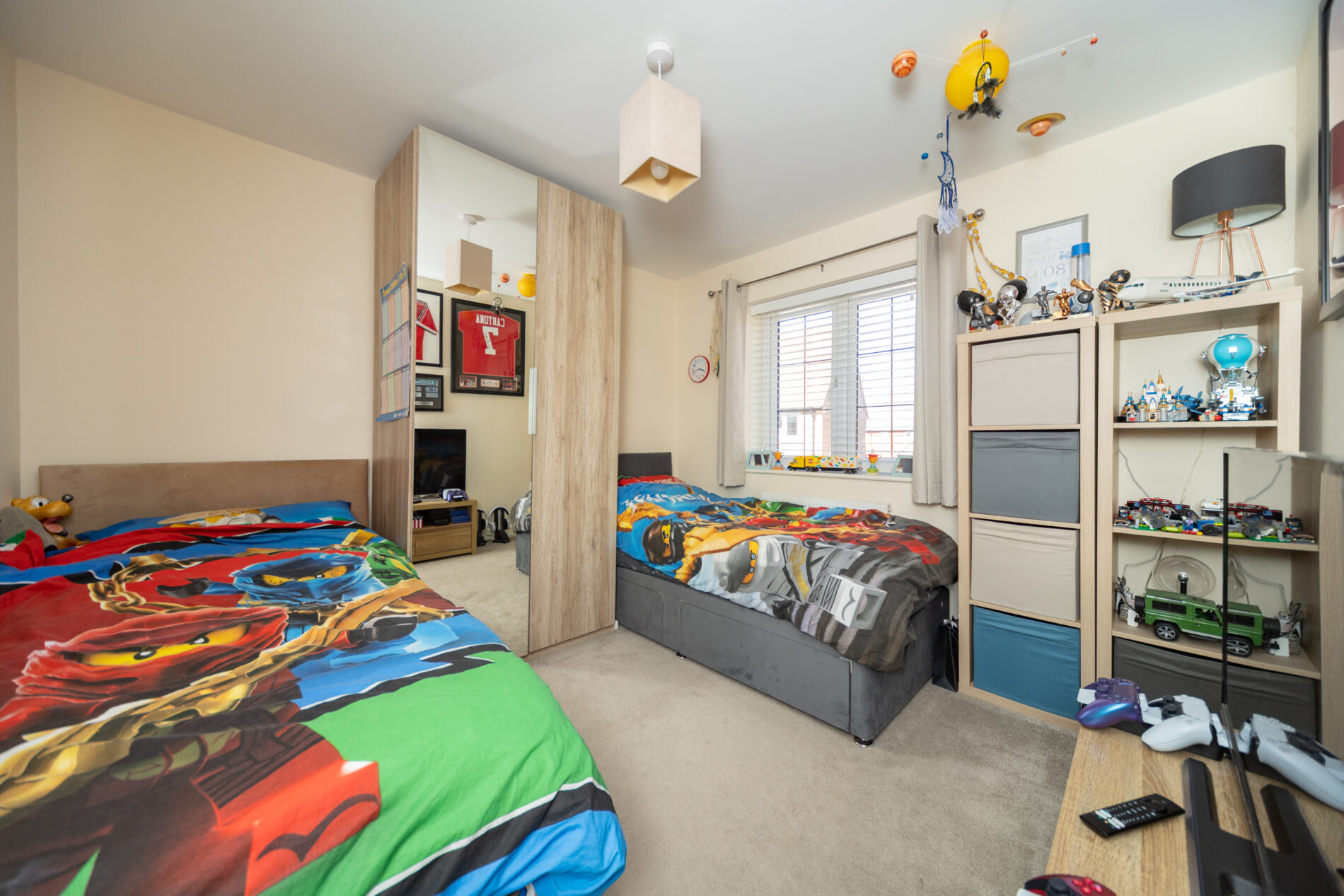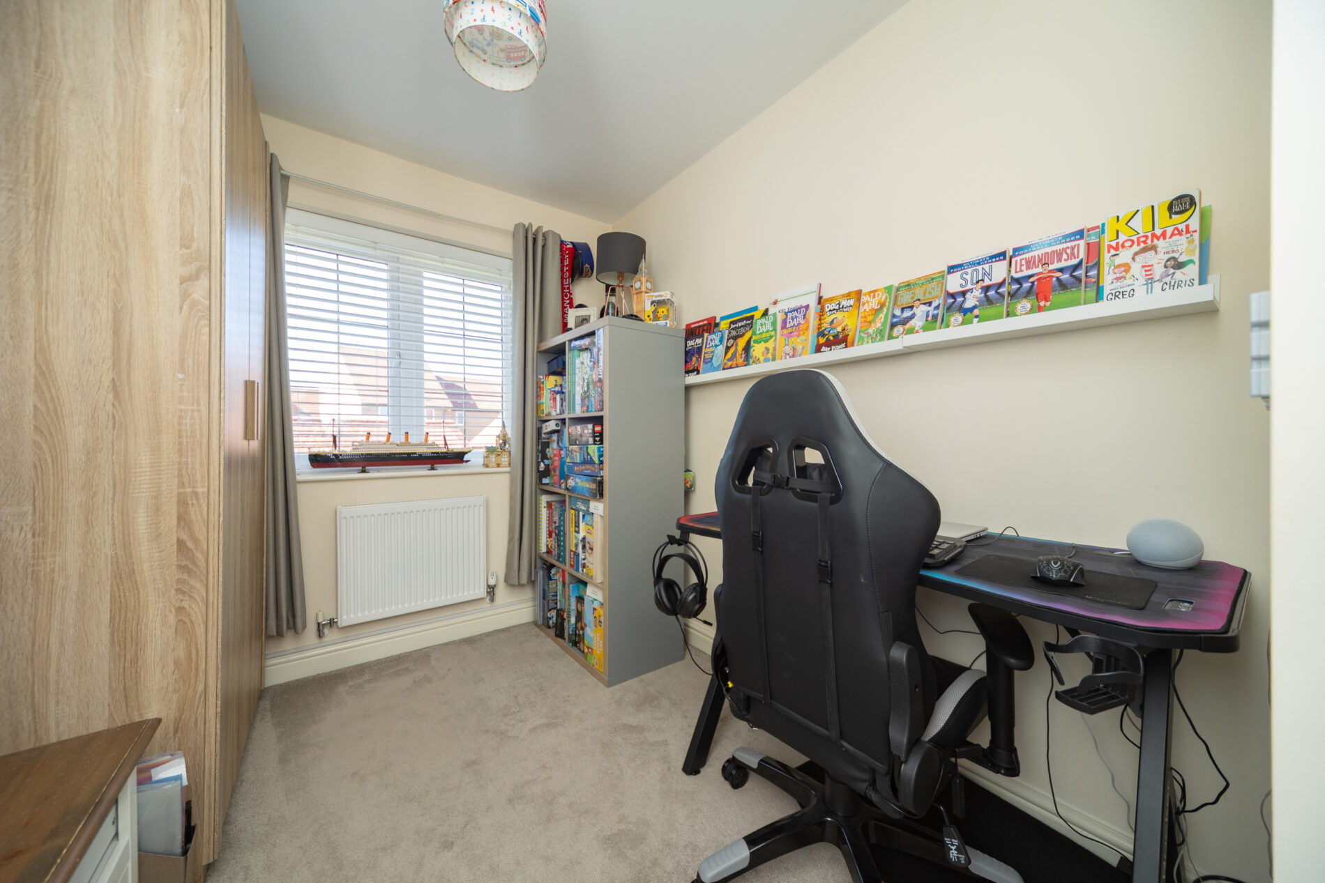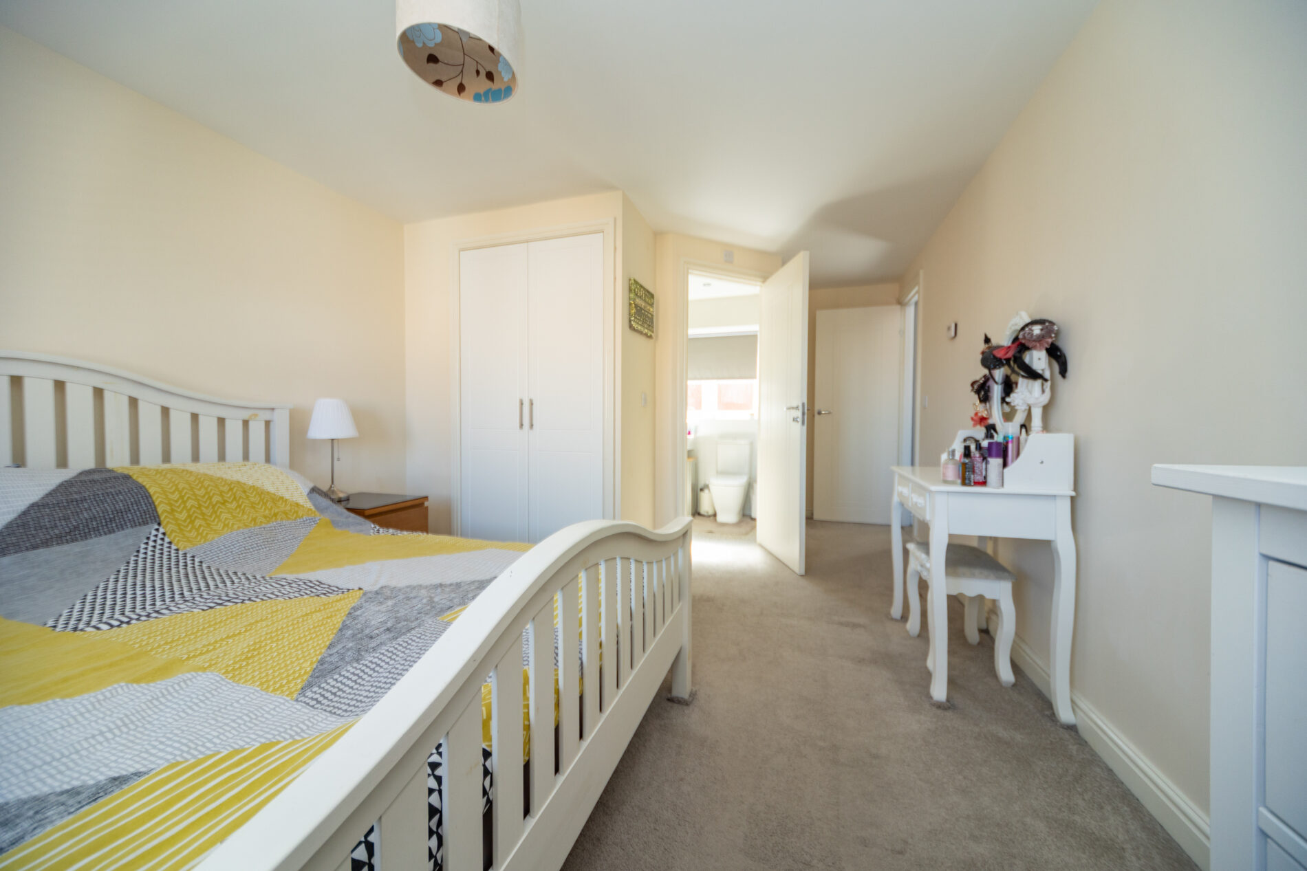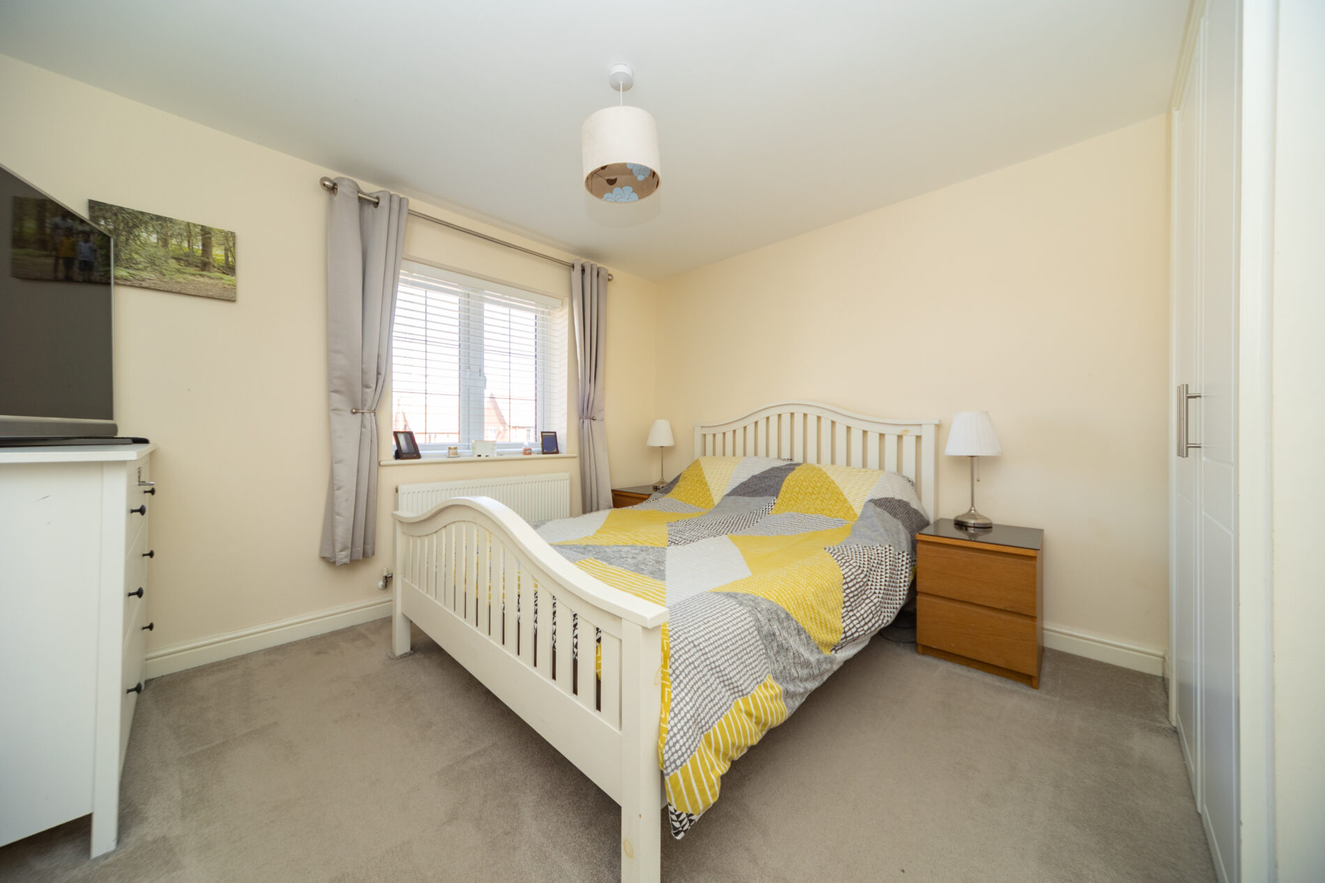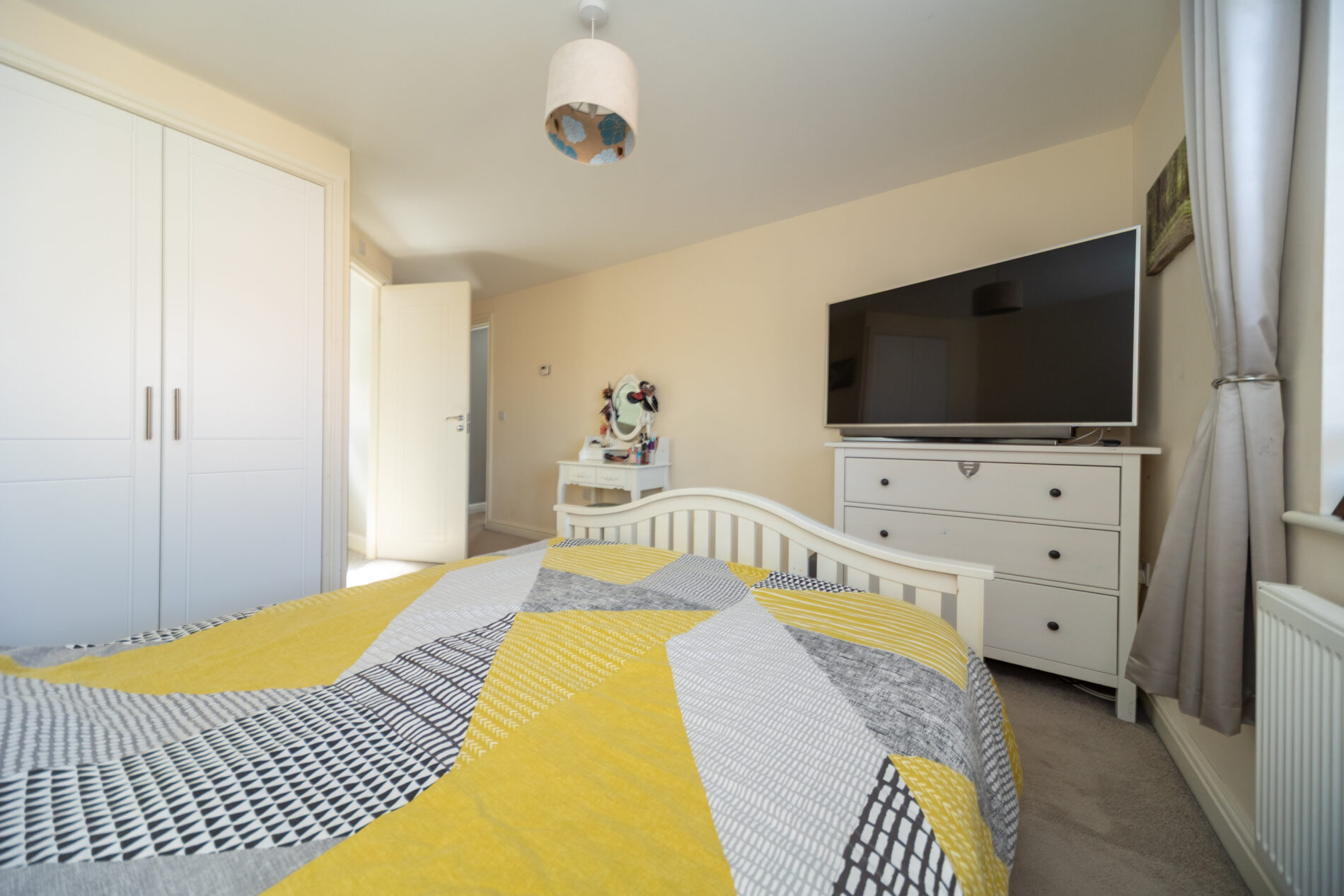 A generously proportioned room with built-in wardrobe, ceiling lighting, radiator and Upvc window to the front elevation. A door leads off to: