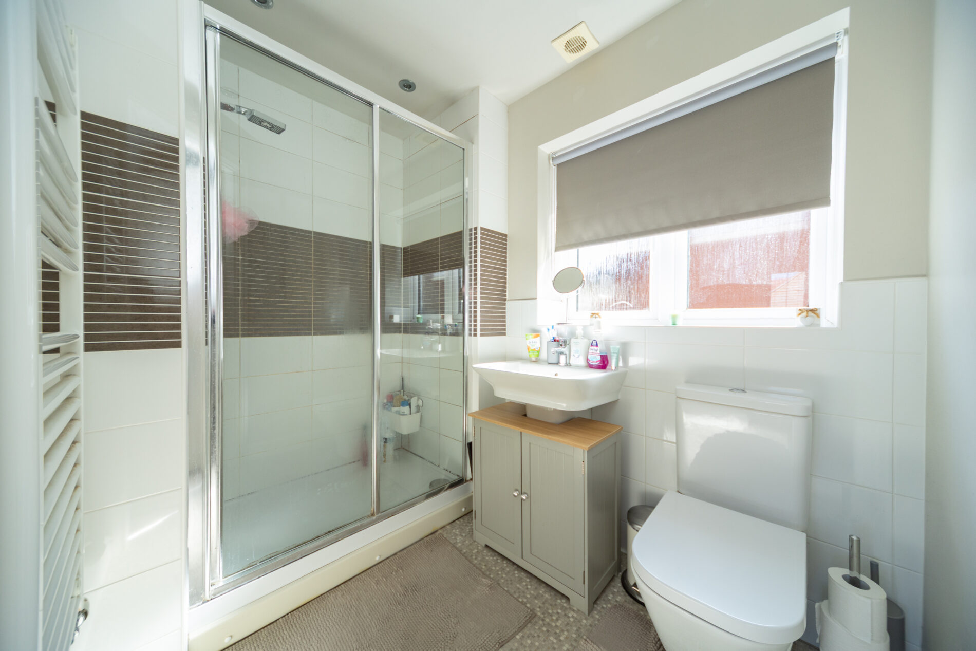 With three piece suite comprising shower cubicle, wash basin and WC plus heated towel rail plus ceiling lighting and radiator, Upvc window to the rear elevation.
