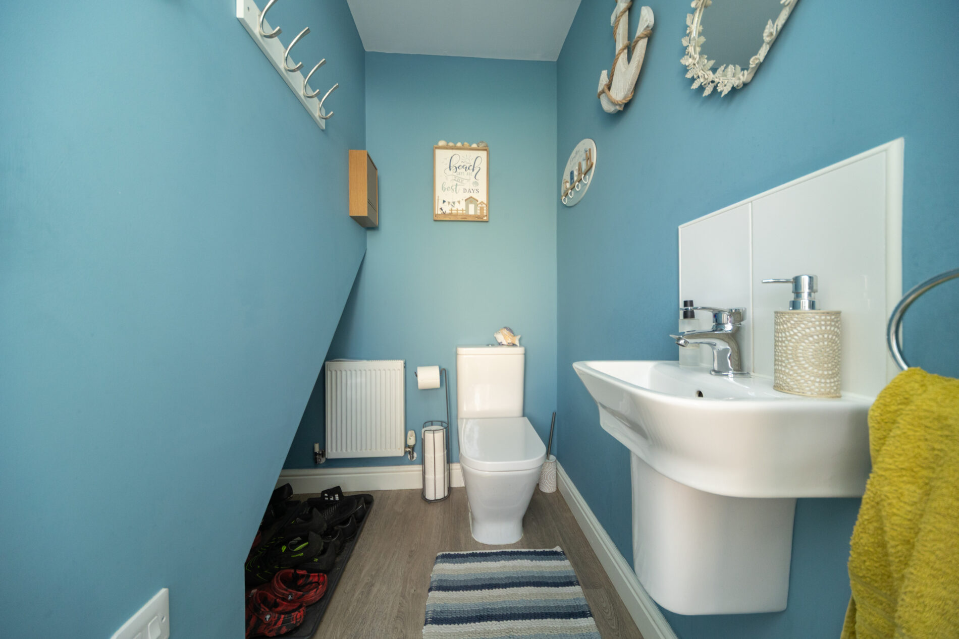 With two-piece suite in white, radiator, ceiling light and extractor fan plus useful under stairs space for storage.