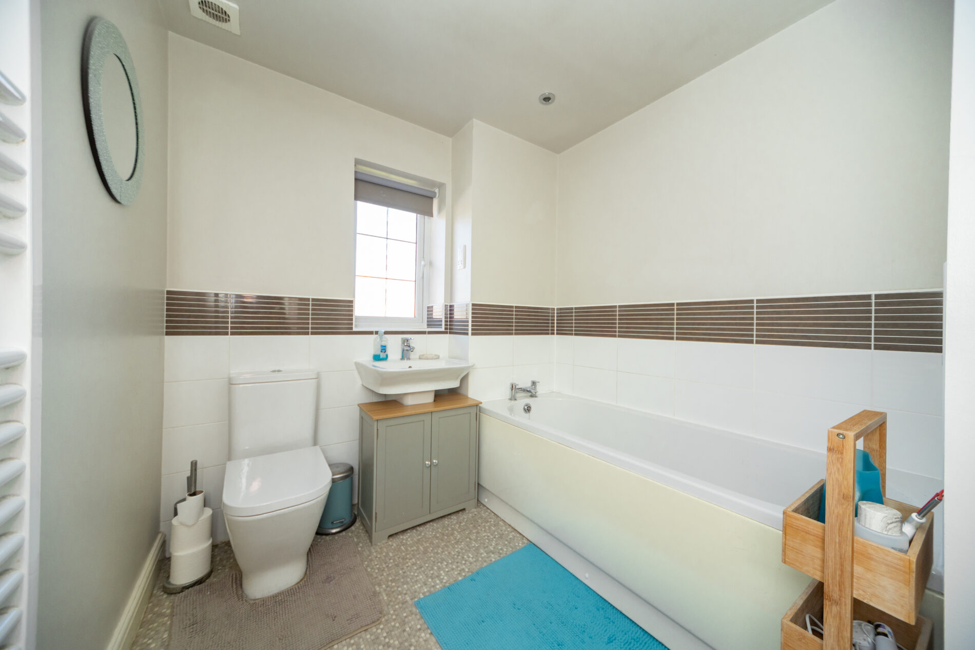 With three piece suite comprising paneled bath, wash basin and WC plus ceiling lighting and extractor, towel radiator and Upvc window to the front elevation.
