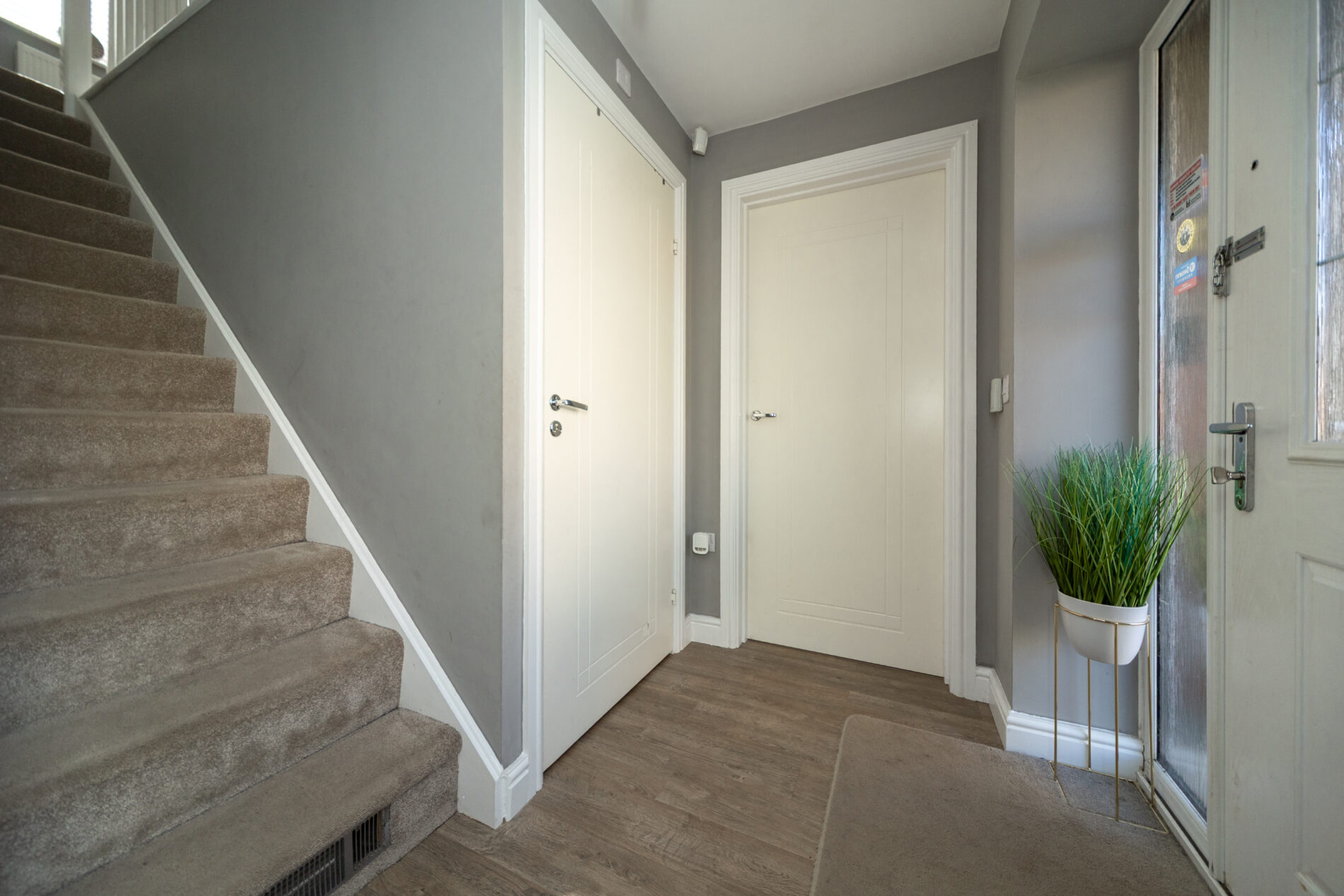 With outside light point and open plan to the front elevation, a composite door with Upvc side panel leads internally to: