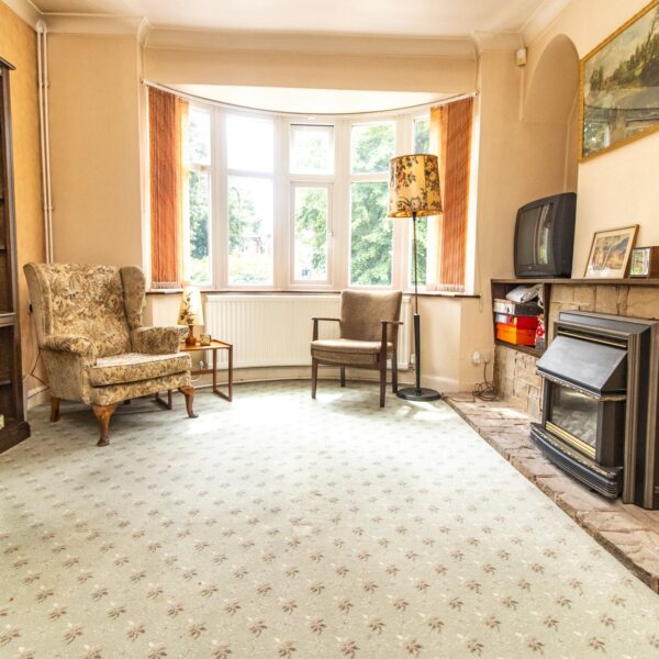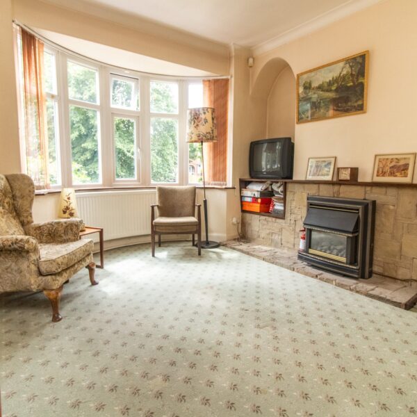 12' 3" x 11' 4" (3.73m x 3.45m) Radiator, UPVC sealed double glazed circular bay window, display fire and surround, archway leading to;