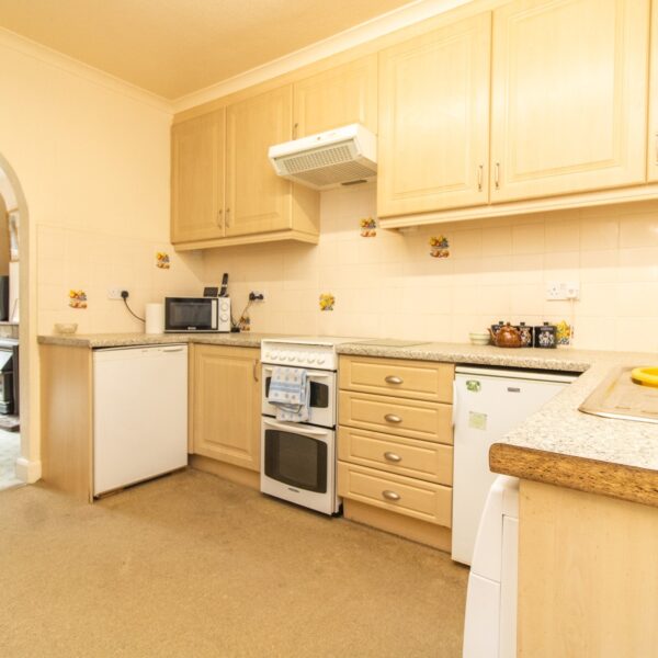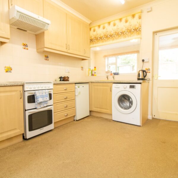 11' 4" x 9' 4" (3.45m x 2.84m) Comprising sink unit with cupboards under, matching range of base units with work surfaces over, drawers and cupboards under, complementary wall mounted eye level cupboards, under stairs cupboard, plumbing for washing machine, tiled splash backs, radiator.