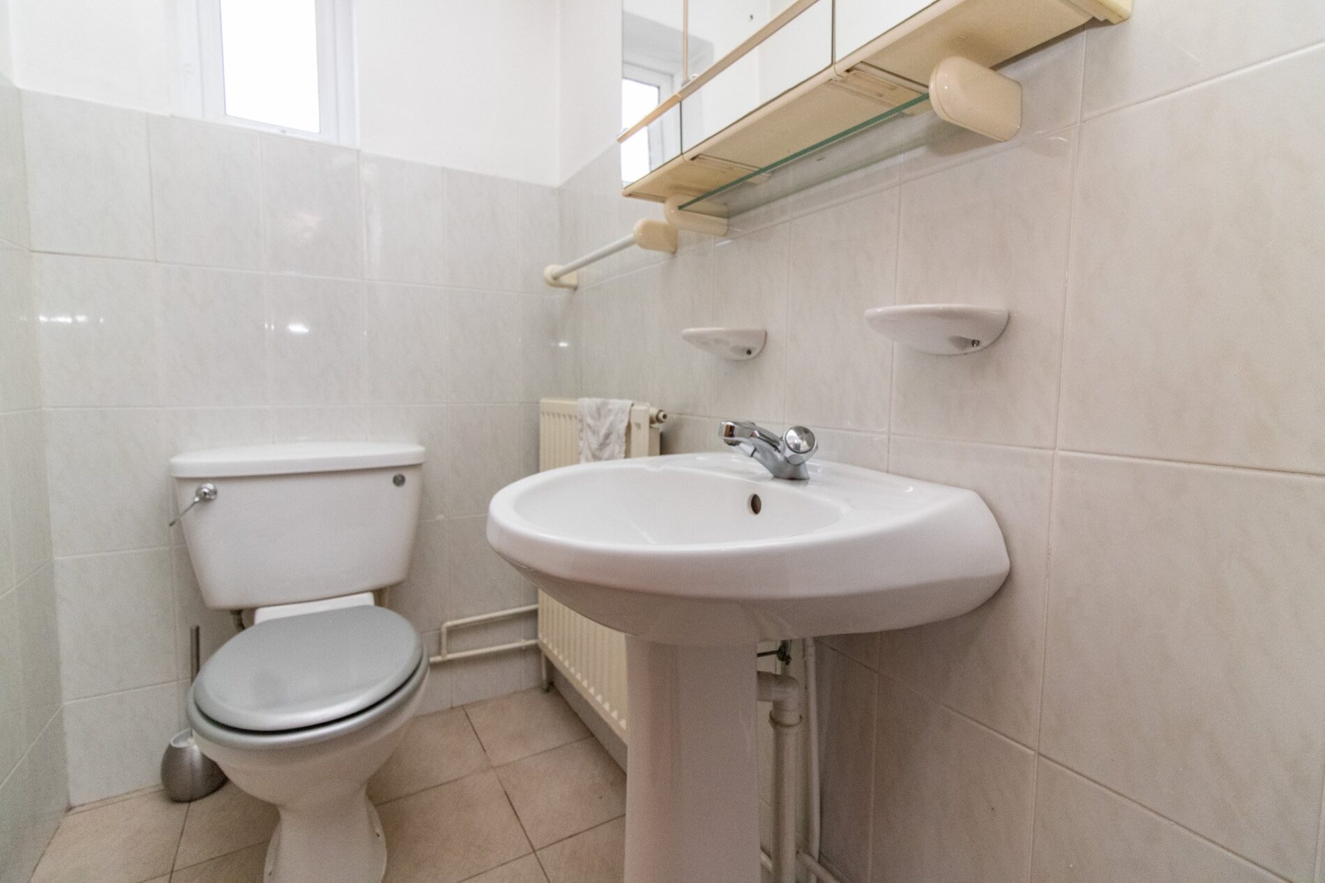 Low level WC and pedestal wash hand basin, radiator, tiled flooring, UPVC sealed double glazed window.