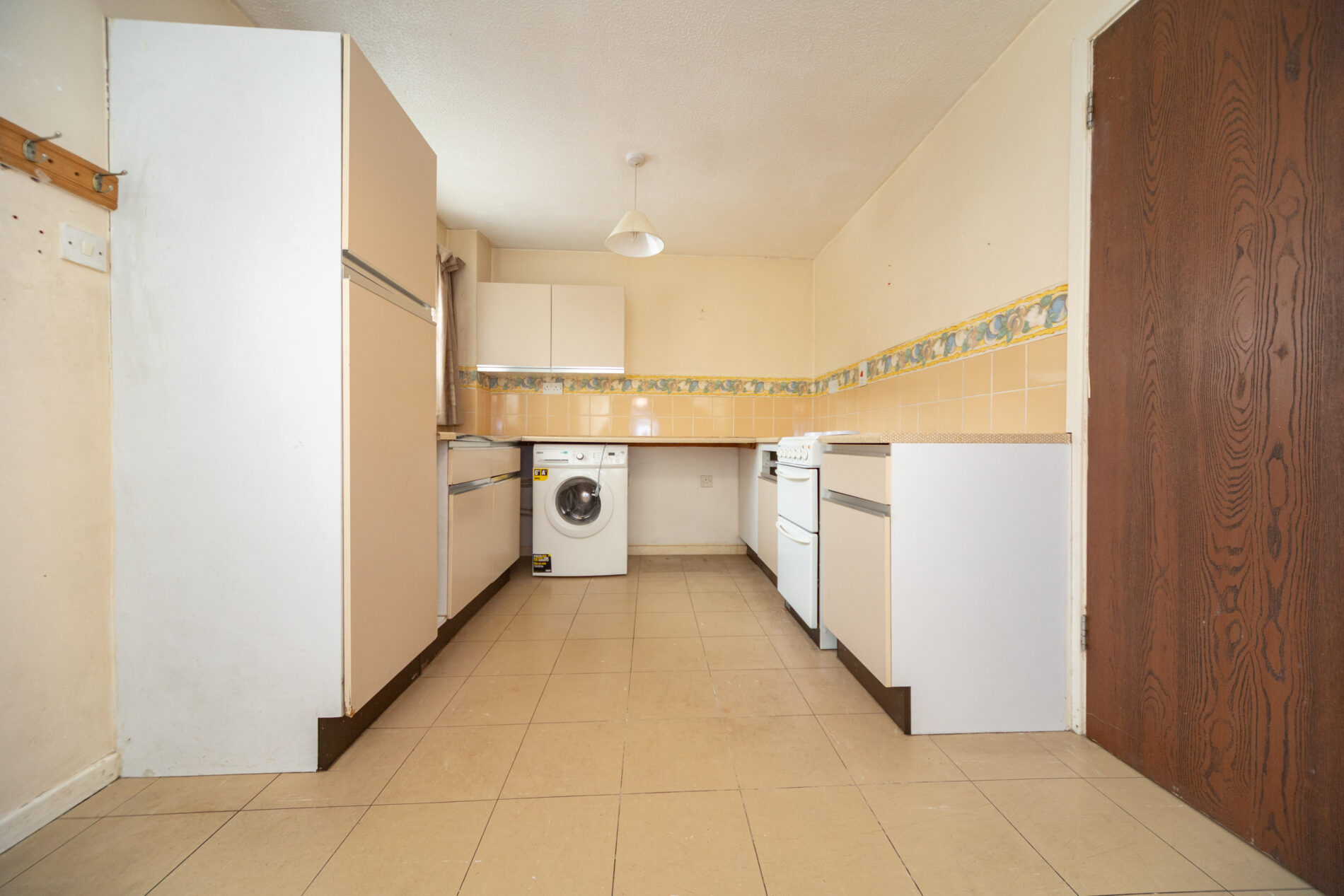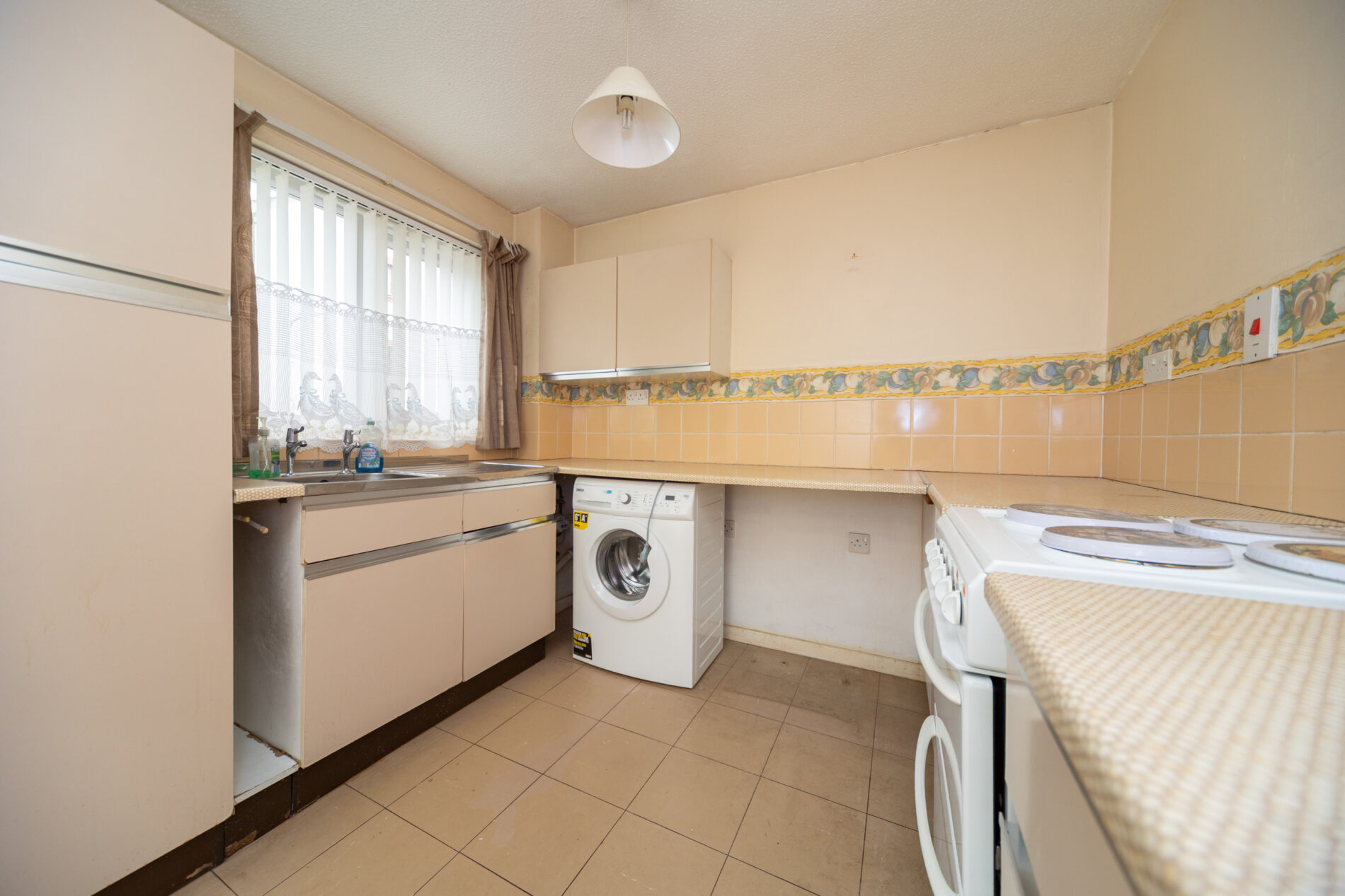 With fitted units to three sides at one end of the room and ample dining space to the other, space for appliances, sink inset to worktop, cooker and washing machine included, Upvc double glazed window and door to the front elevation, electric heater.