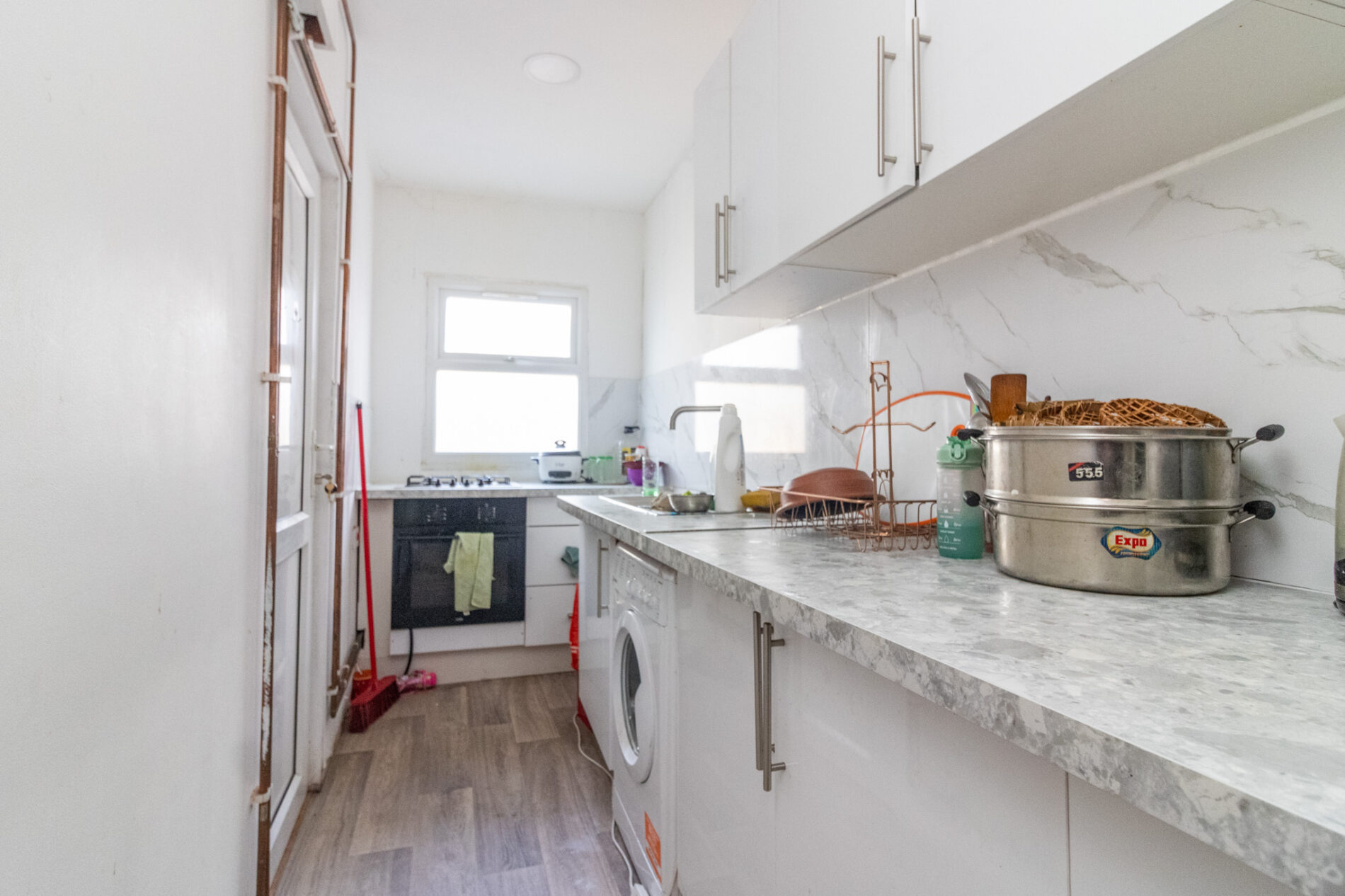 Comprising sink unit with cupboards under, matching base units with work surfaces over, drawers and cupboards under, complementary wall mounted eye level cupboards, built in oven and four piece gas hob, plumbing for washing machine, easy wipe splash back, door to rear garden, UPVC sealed double glazed window.