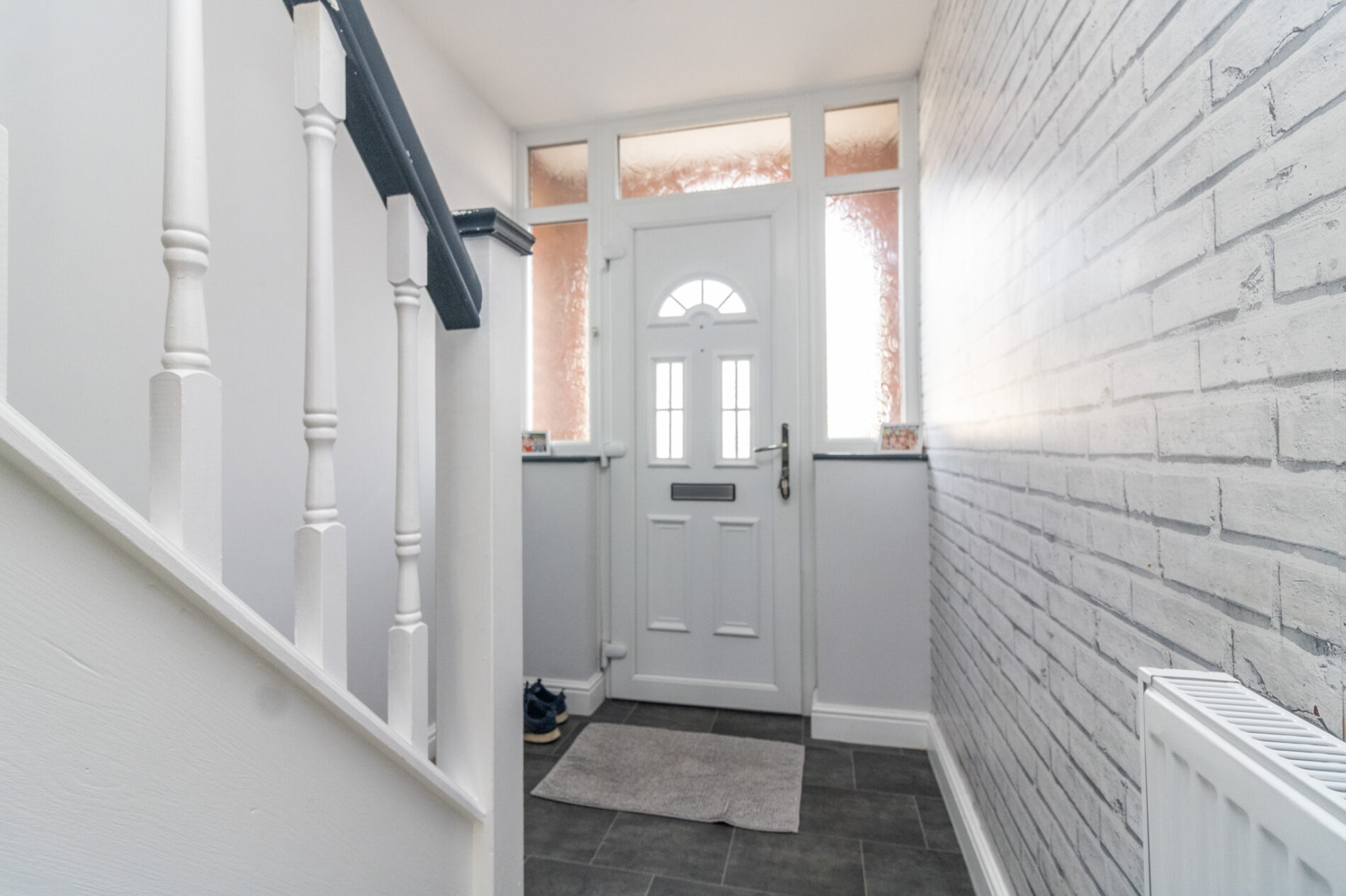 UPVC sealed double glazed door with matching side panels sei in arched original storm porch with minton tiled base leading to;