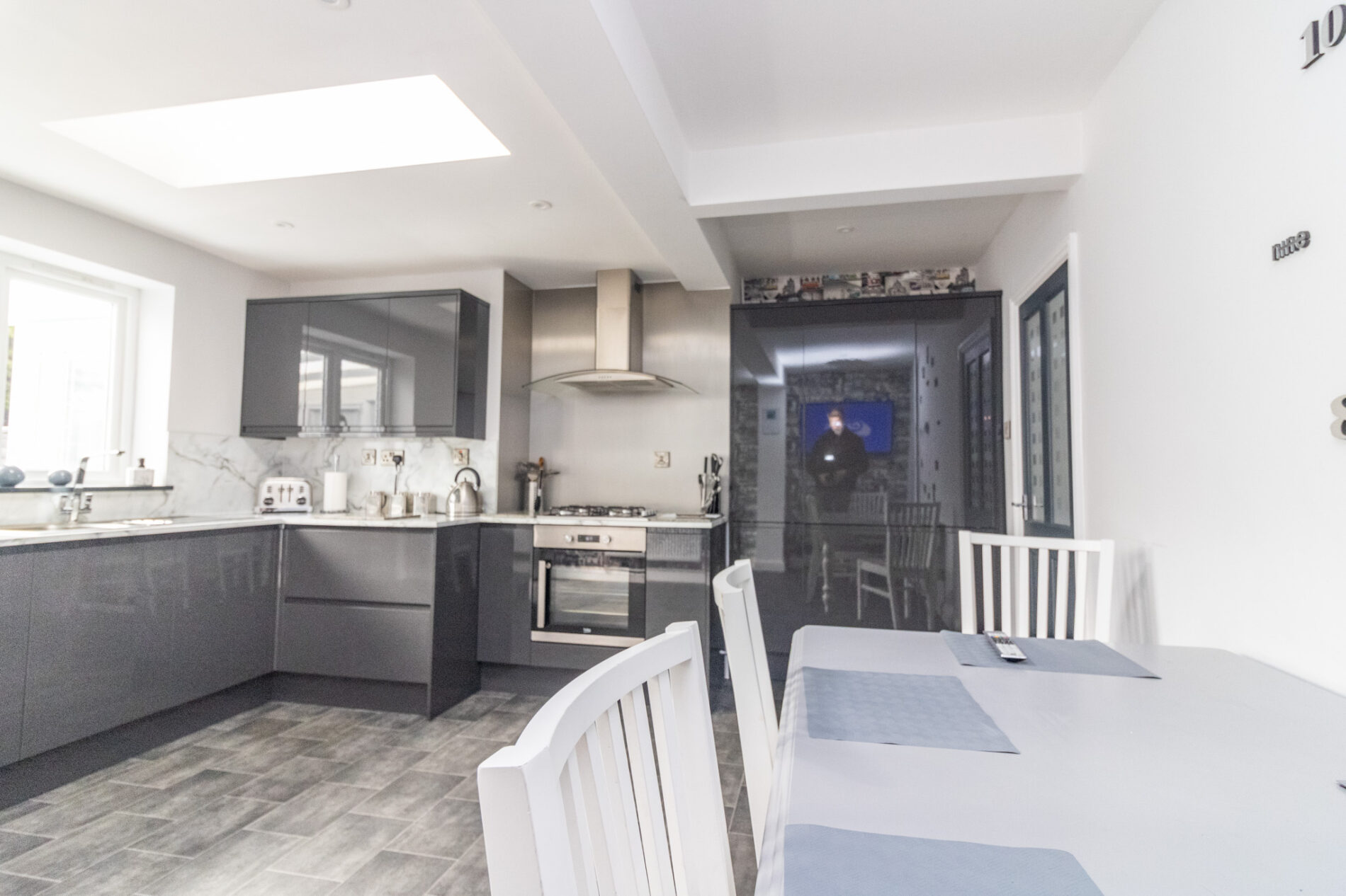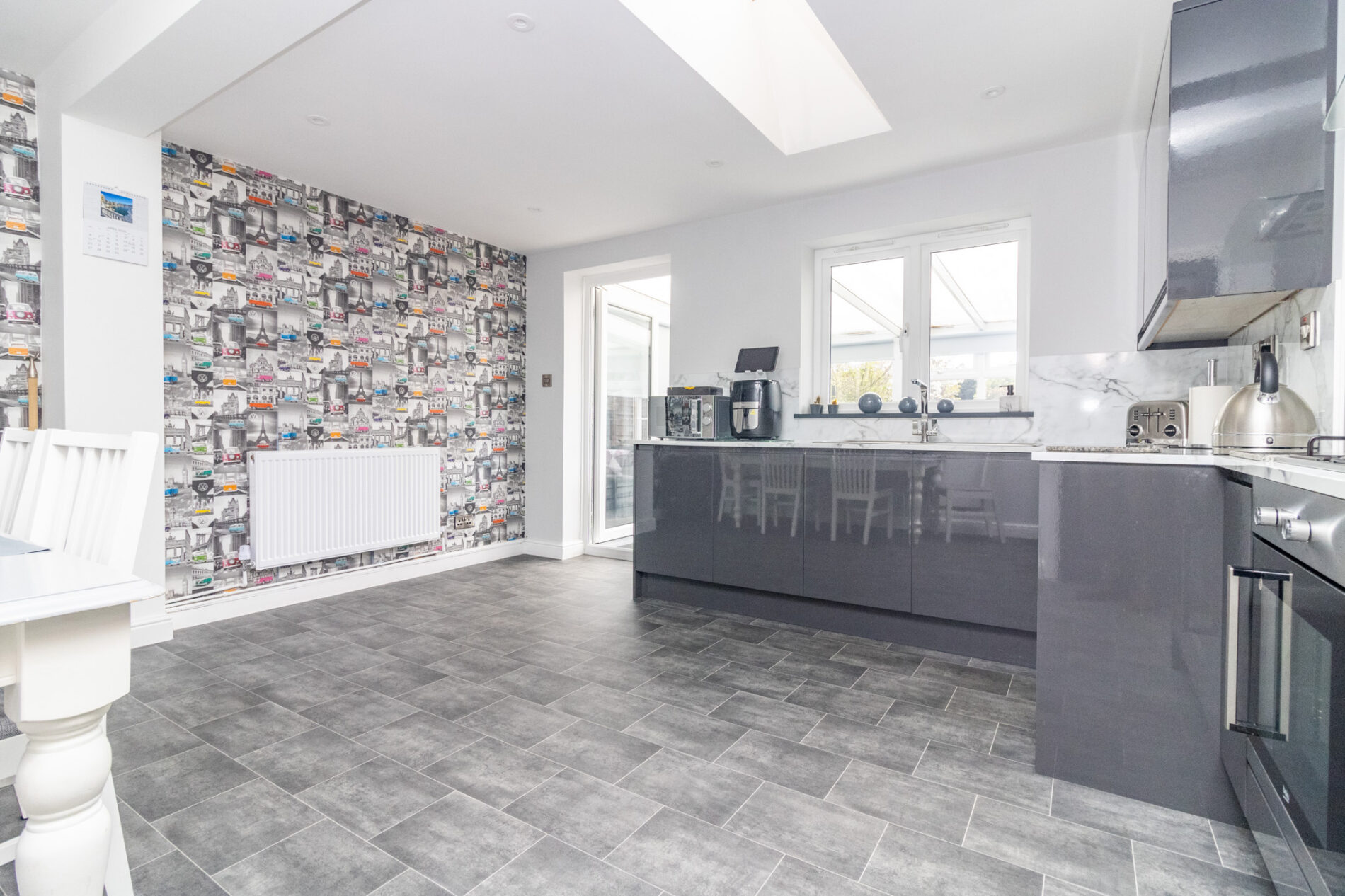 Recently refitted in a range of soft close gloss black units comprising one and a half bowl sink unit with mixer taps over, drawers and cupboards under, matching range of base units with marble effect Quartz worktops over, cupboards and deep pan drawers under, complementary wall mounted eye level cupboards, pull out larder cupboards, integrated dishwasher and fridge/freezer, built in oven and hob with extractor fan over set in stainless steel hood with matching splash back, spotlights, radiator, sealed double glazed Velux window providing natural light, UPVC sealed double glazed window, UPVC sealed double glazed French door to;