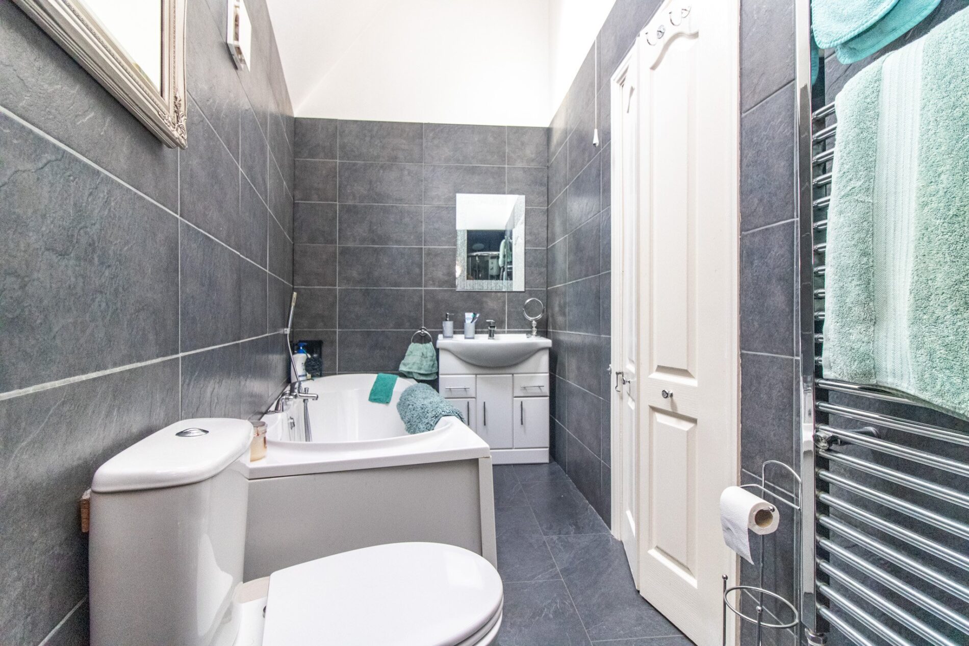 14' 7" x 5' 8"max (4.45m x 1.73m) Four piece suite comprising tiled corner shower cubicle, paneled bath, Vanity sink unit and low level WC, Velux sealed double glazed window, heated towel rail, large tiling throughout.