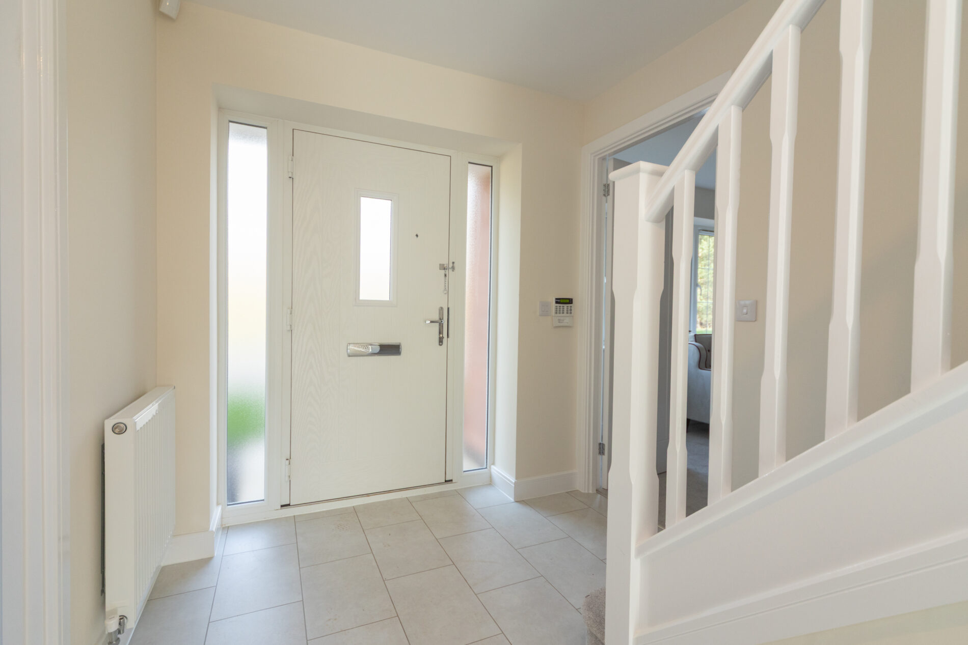 With stairs to the first floor and useful under-stairs storage, ceiling lighting, radiator and composite door with Upvc side screens to the front elevation.