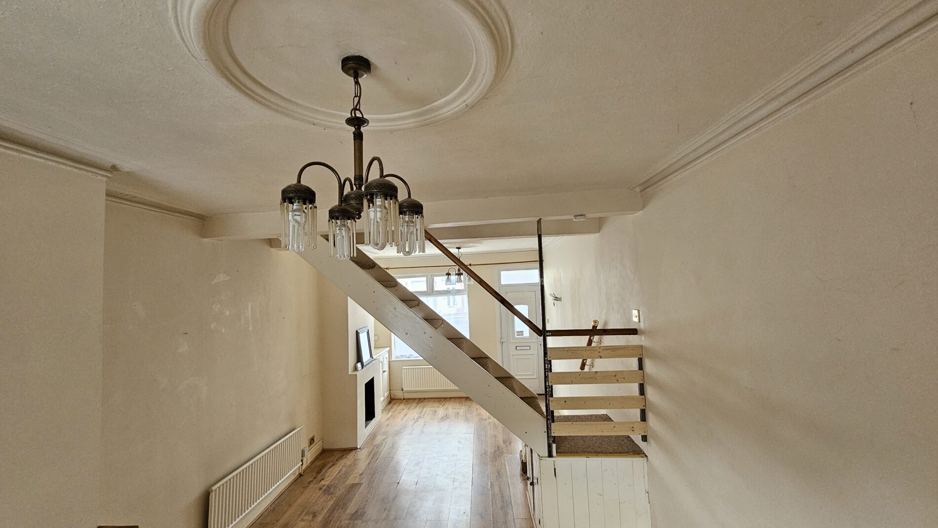 Central stairwell leading to first floor accommodation, radiators, duel aspect UPVC sealed double glazed windows, display fire surrounds, TV point, ornate coving.