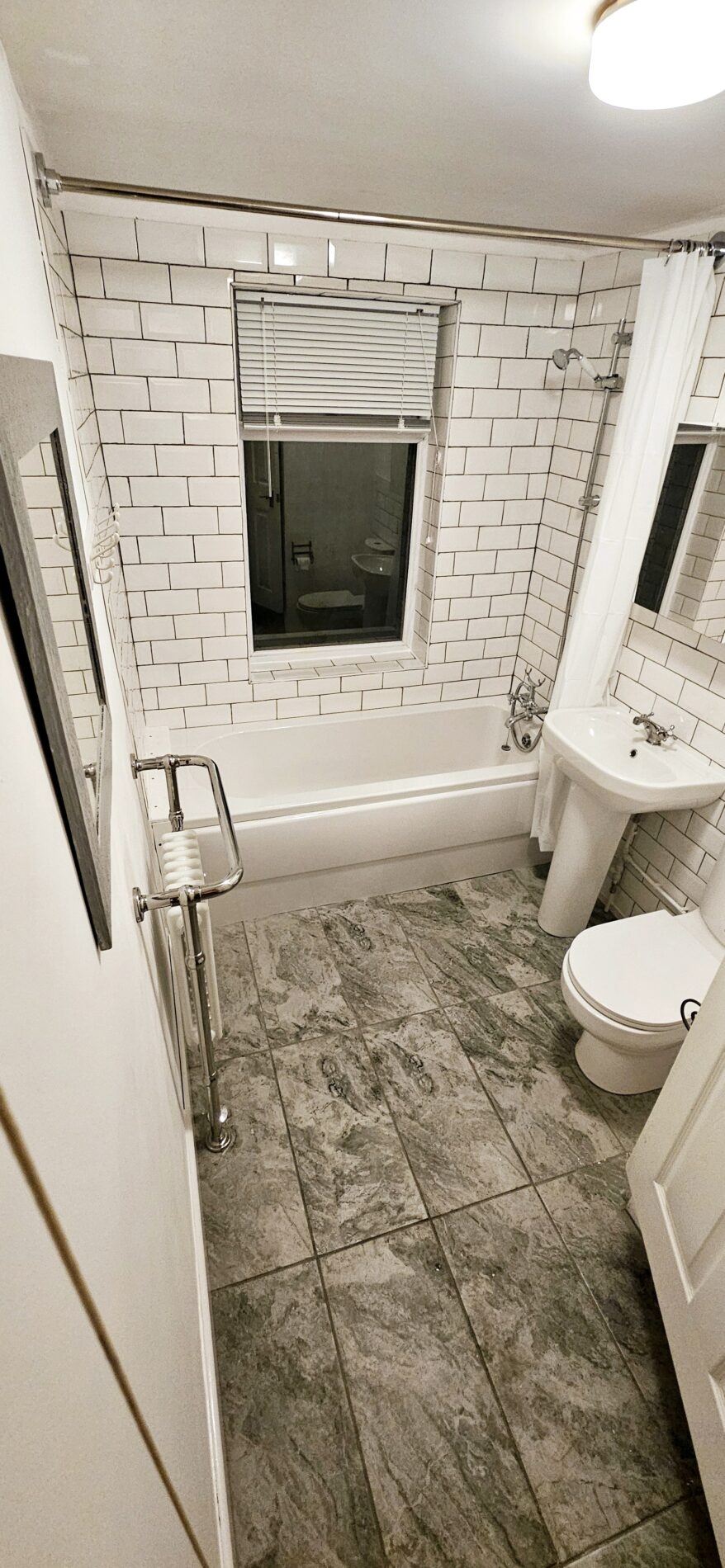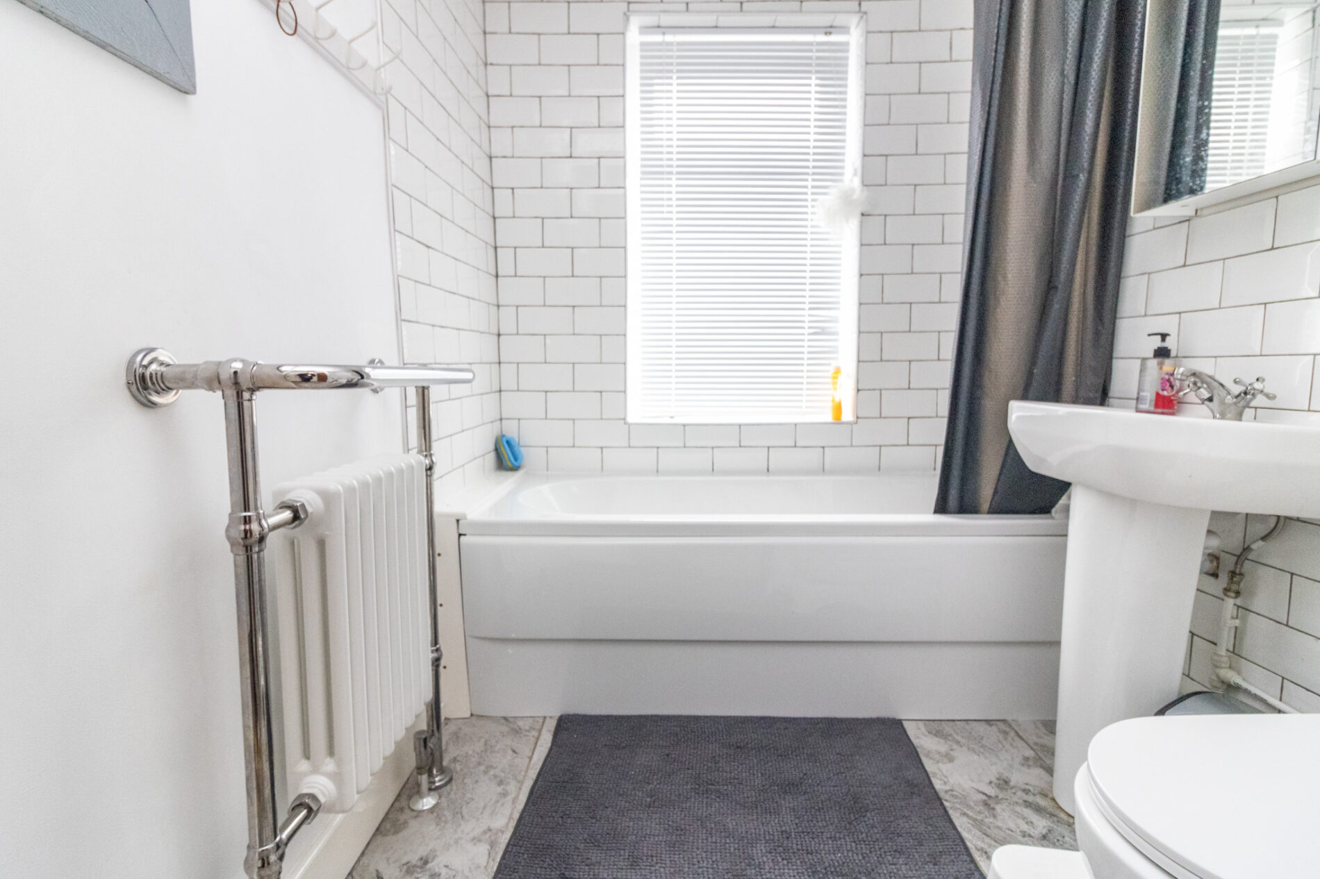 Three piece suite comprising panelled bath with Victorian style shower attachment, pedestal wash hand basin and low level WC, Victorian style radiator incorporating towel rail, rectangle tiled splash backs, cupboard housing Worcester central heating boiler.