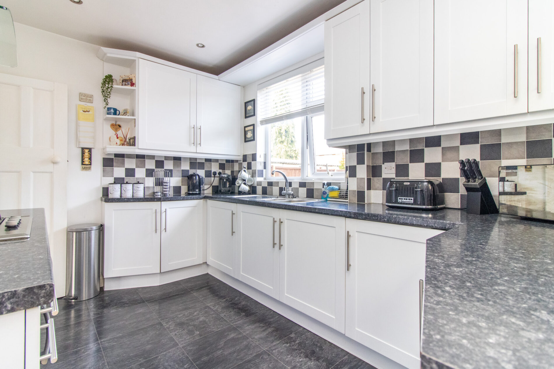 Comprising one and a half bowl sink unit with cupboards under, matching range of base units with work surfaces over, drawers and cupboards under, complementary wall mounted eye level cupboards, built in oven and four piece gas hob with extractor fan over set in stainless steel hood, integrated washing machine and fridge, understairs cupboard, door to side aspect, UPVC sealed double glazed window, tiled splash backs.