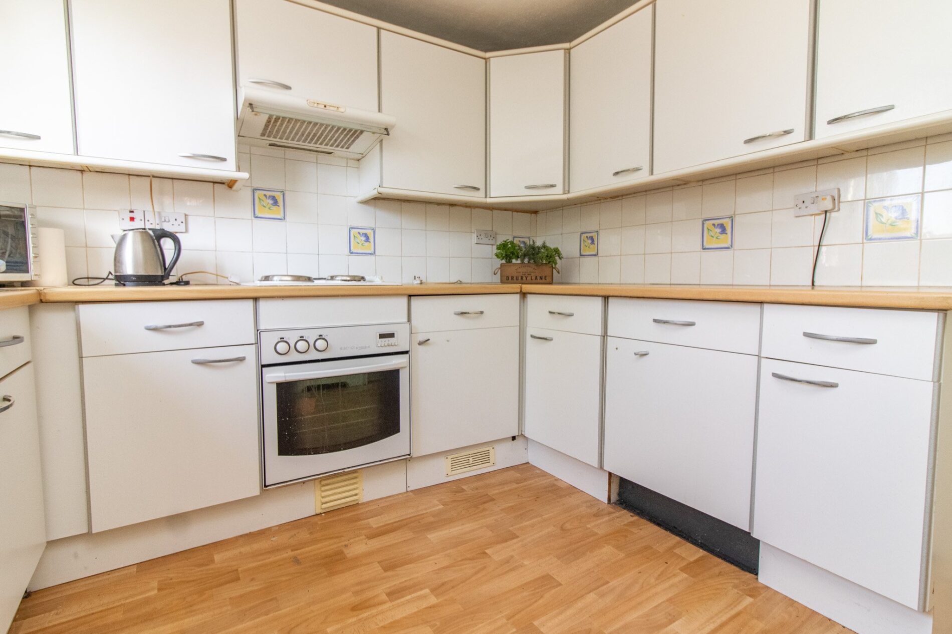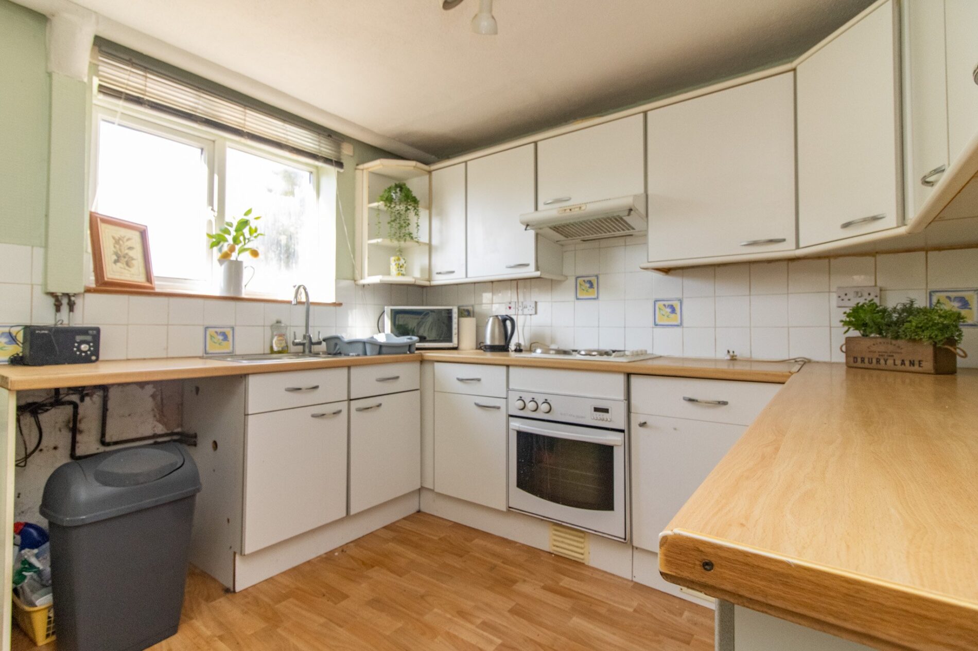 9' 10" x 9' 10" (3.00m x 3.00m) Comprising sink unit with cupboards under, matching base units with work surfaces over, drawers and cupboards under, complementary wall mounted eye level cupboards, plumbing for washing machine, built in oven and four piece hob with extractor fan over, UPVC sealed double glazed window.