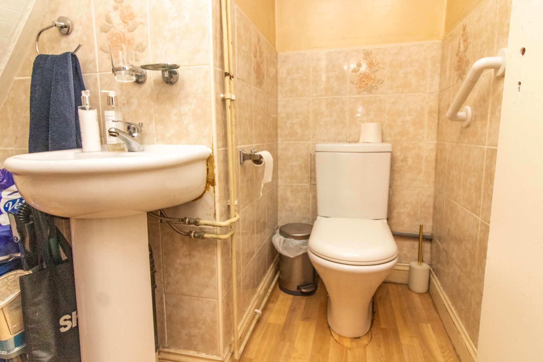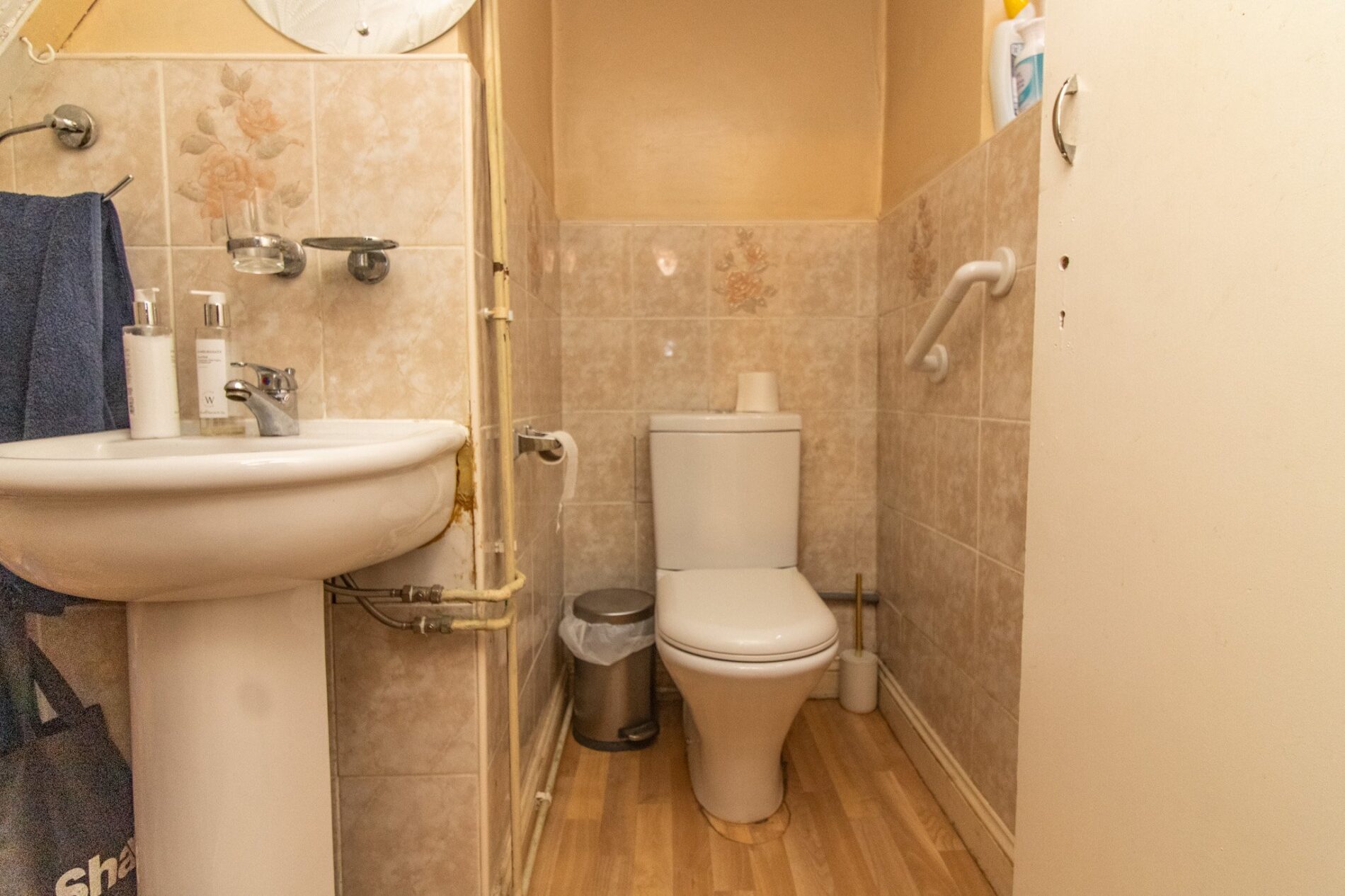 Low level WC and wash hand basin, tiled splash backs, wood stained style UPVC sealed double glazed window.