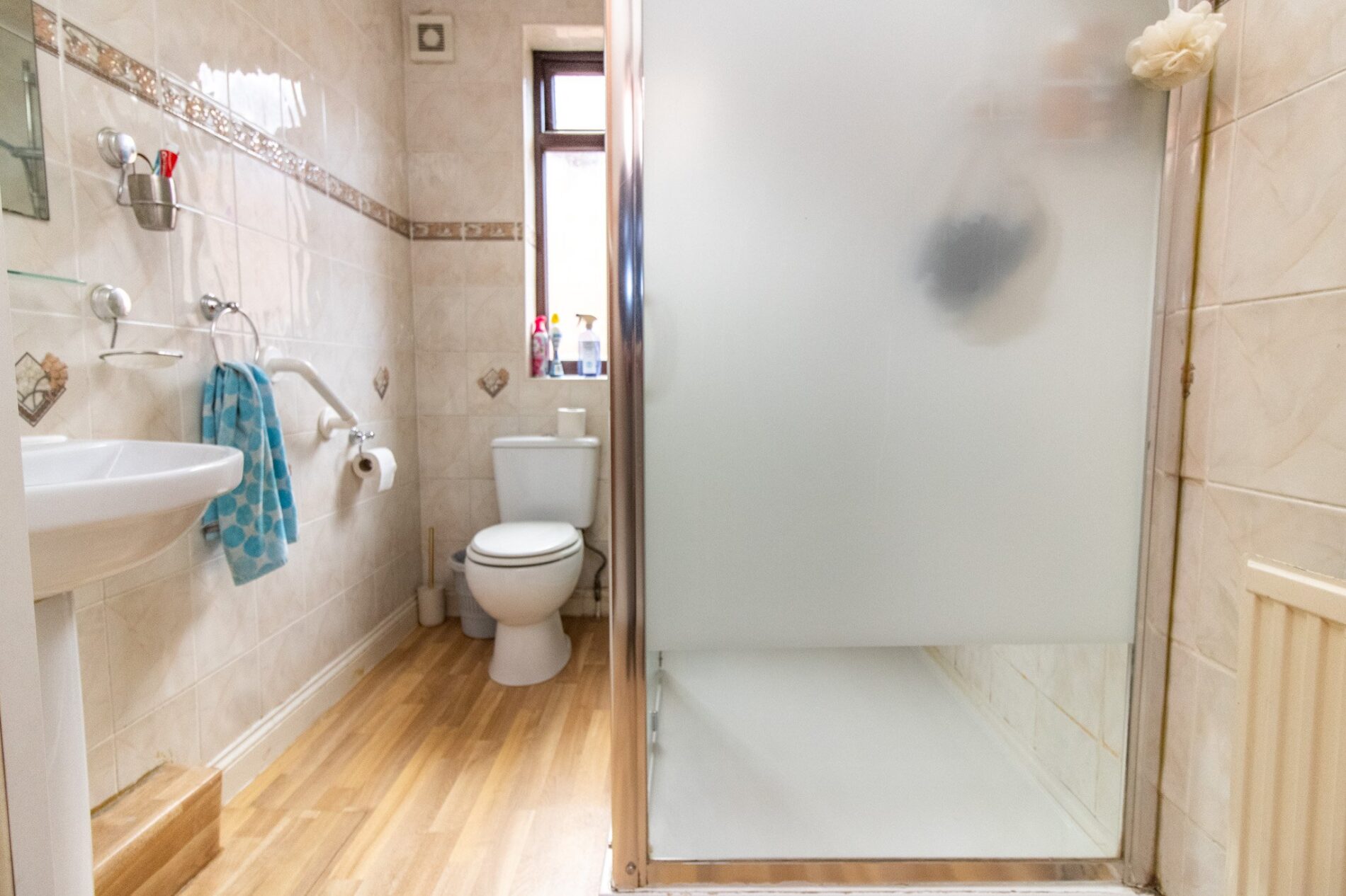 9' 10" x 5' 10" (3.00m x 1.78m) Three piece suite comprising walk in tiled shower cubicle, pedestal wash hand basin and low level WC, radiator, tiled throughout, airing cupboard housing central heating boiler.