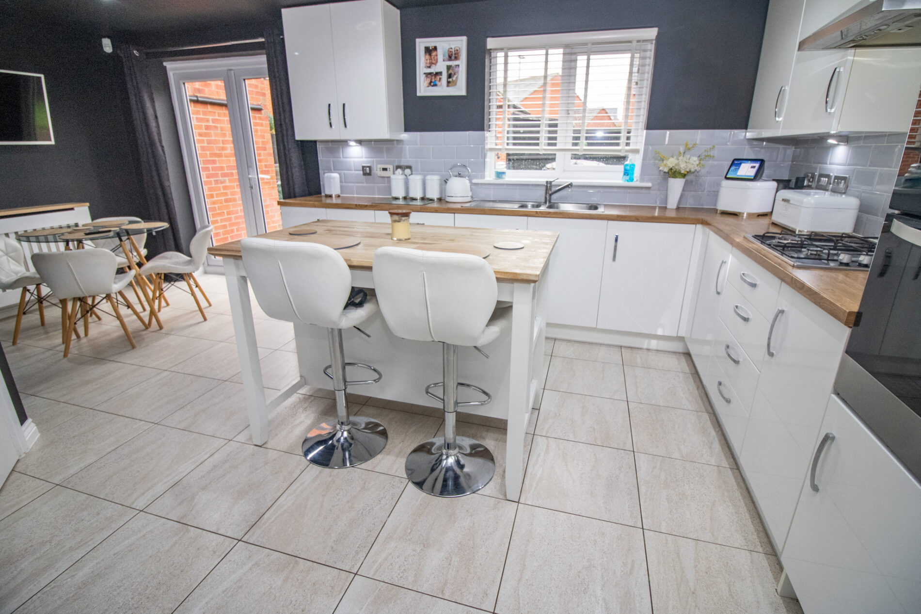 Fitted in an extensive range of soft close white gloss units comprising one and a half bowl sink unit with cupboards under, matching range of base units with butcher block style work surfaces over, drawers and cupboards under, complementary wall mounted eye level cupboards, built in oven/grill and four piece gas hob with extractor fan over set in stainless steel hood, integrated fridge/freezer and dishwasher, central Island style breakfast bar with storage under, UPVC sealed double glazed windows, tiled flooring, tiled splash backs, UPVC sealed double glazed window, UPVC sealed double glazed French doors to rear garden.