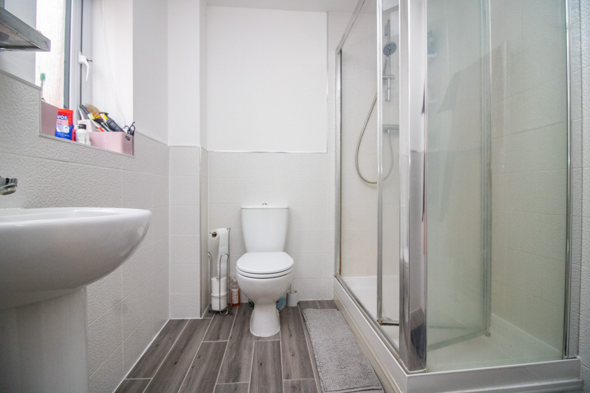 Three piece suite comprising walk in tiled shower cubicle, pedestal wash hand basin and low level WC, heated towel rail , half wall tiling, UPVC sealed double glazed window