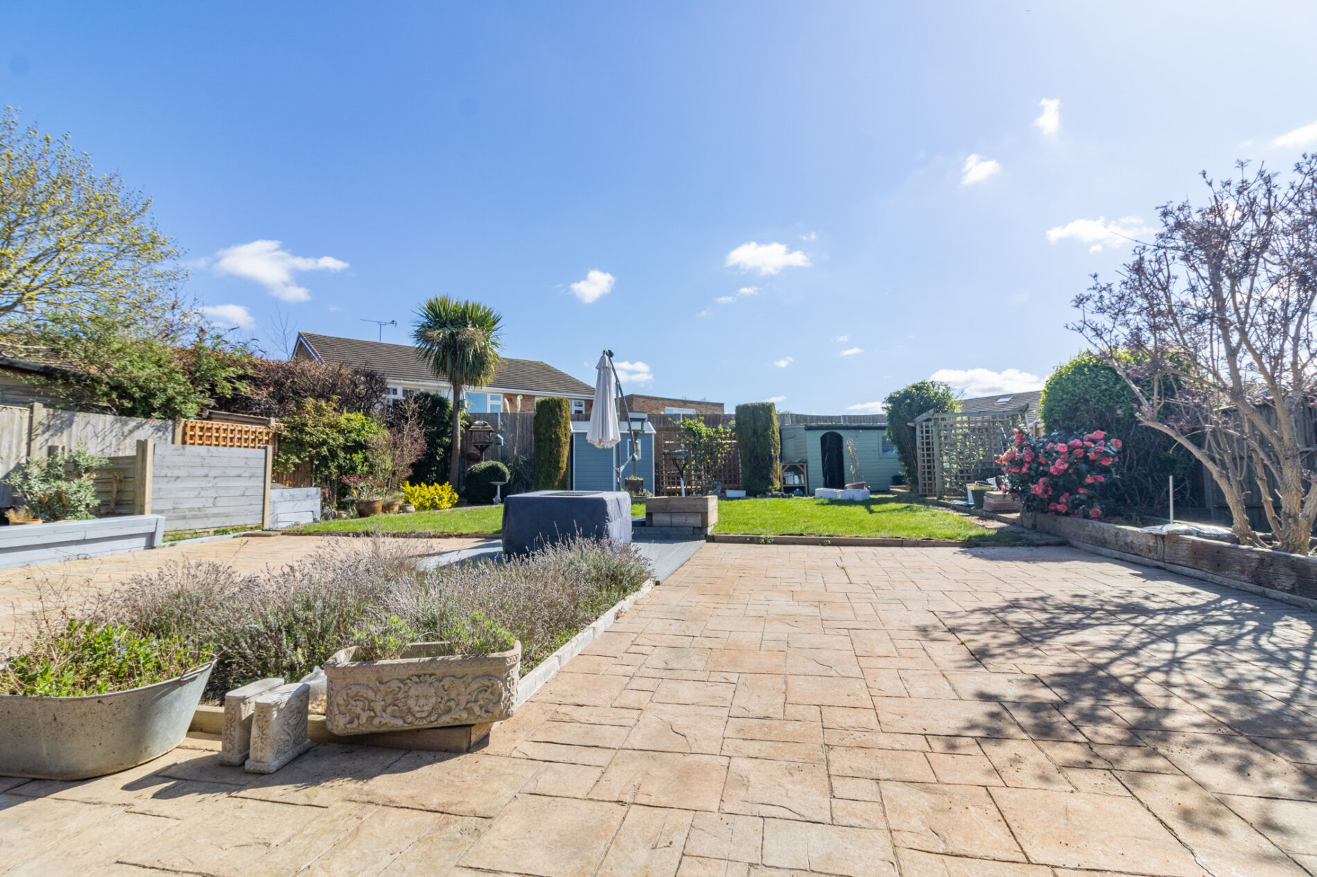 Large rear garden comprising spacious patio seating area to rear and side with raised timber sleeper floral and evergreen borders, central decked seating area, lawns with well stocked floral beds, inset evergreen beds, pet enclosure, timber sheds, gated access to side. Tarmac driveway to front providing parking leading to single garage with further blocked paving parking area.