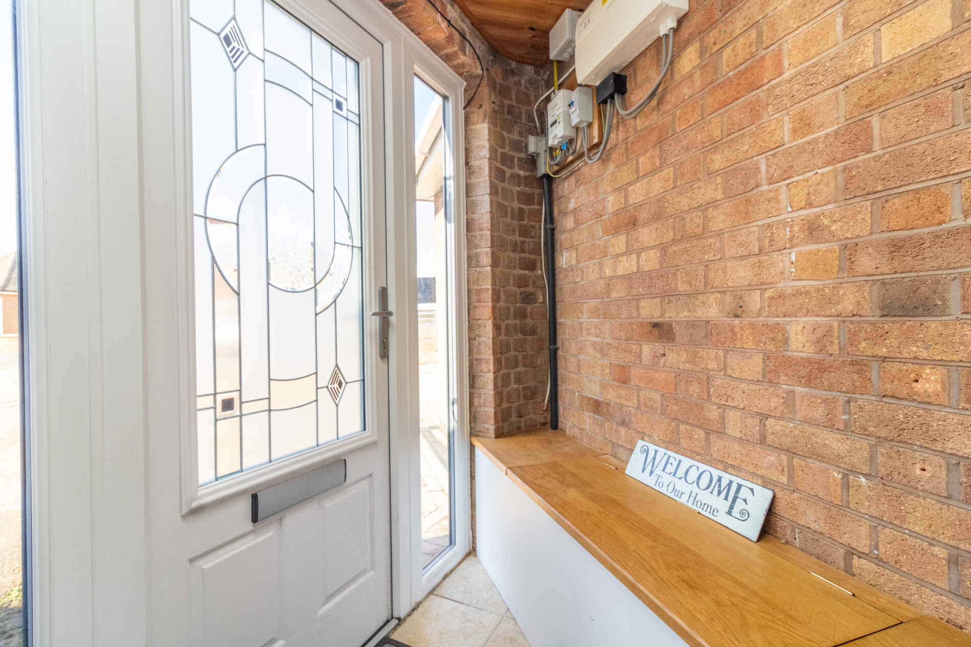 Exposed brickwork, tiled flooring, storage seat, leaded light and stained UPVC sealed double glazed door with matching side panel leading to;