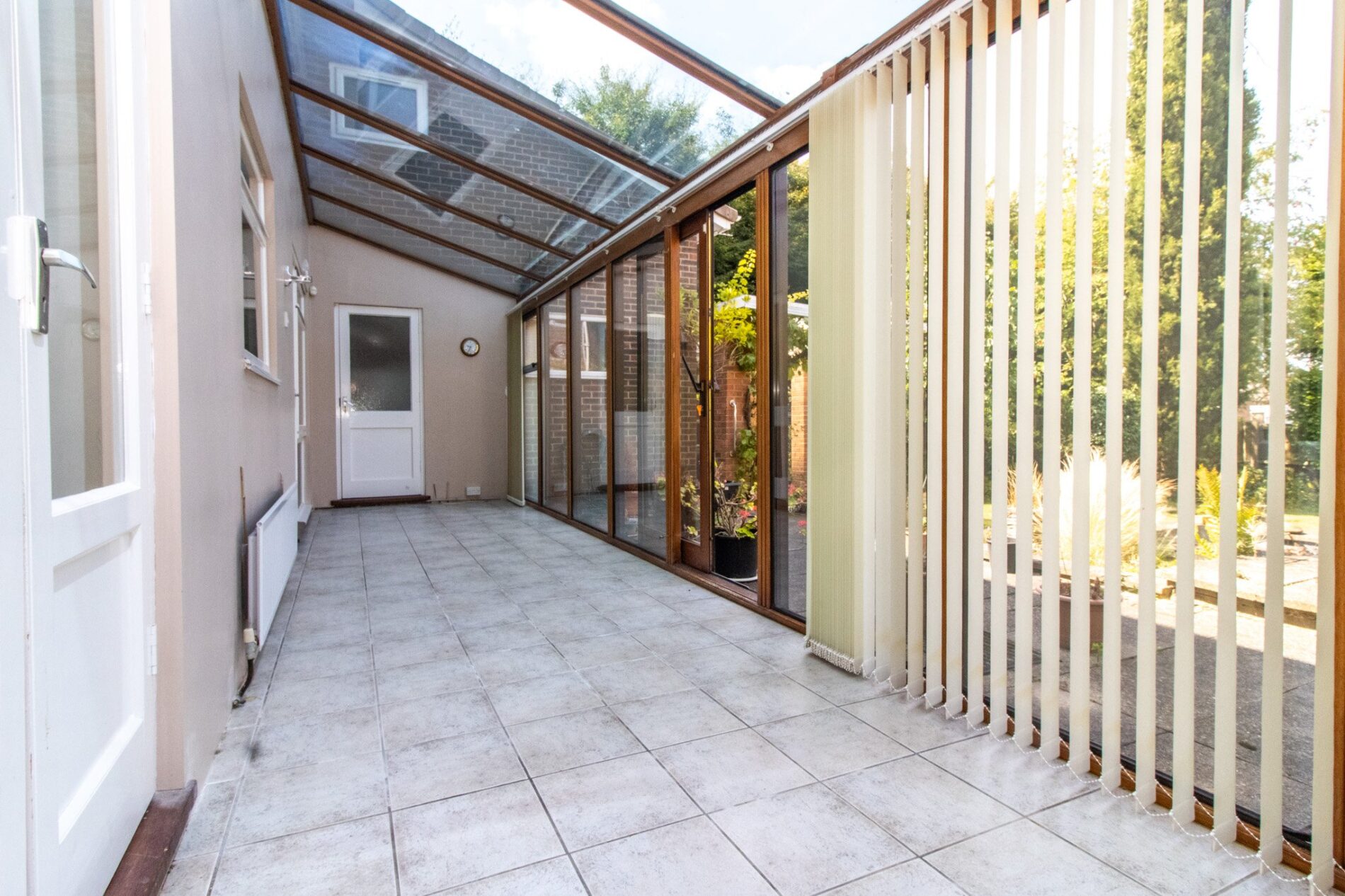 26' 5" x 6' 0" (8.05m x 1.83m) Sealed double glazed picture windows overlooking gardens with central matching sliding doors, tiled flooring.