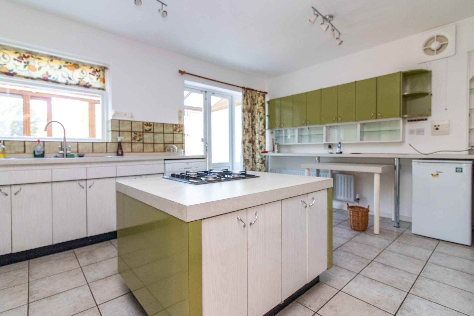 15' 3" x 13' 0" (4.65m x 3.96m) Fitted in a range of units comprising one and a half bowl sink unit with cupboards under, matching base units with work surfaces over, drawers and cupboards under, complementary wall mounted eye level cupboards, central Island with inset four piece gas hob and drawers under, built in oven, grill and microwave, fridge/freezer space, plumbing for washing machine, breakfast bar, radiator, tiled flooring, UPVC sealed double glazed French doors leading to;