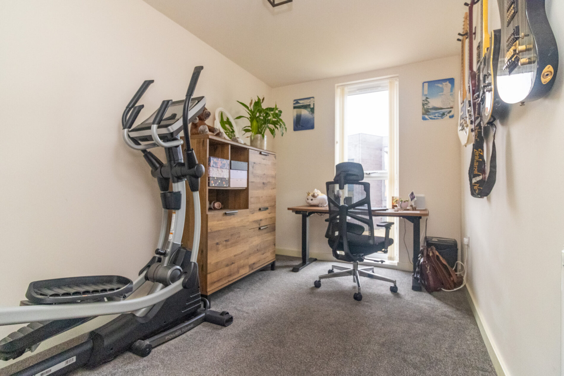 Radiator, tall UPVC sealed double glazed window.