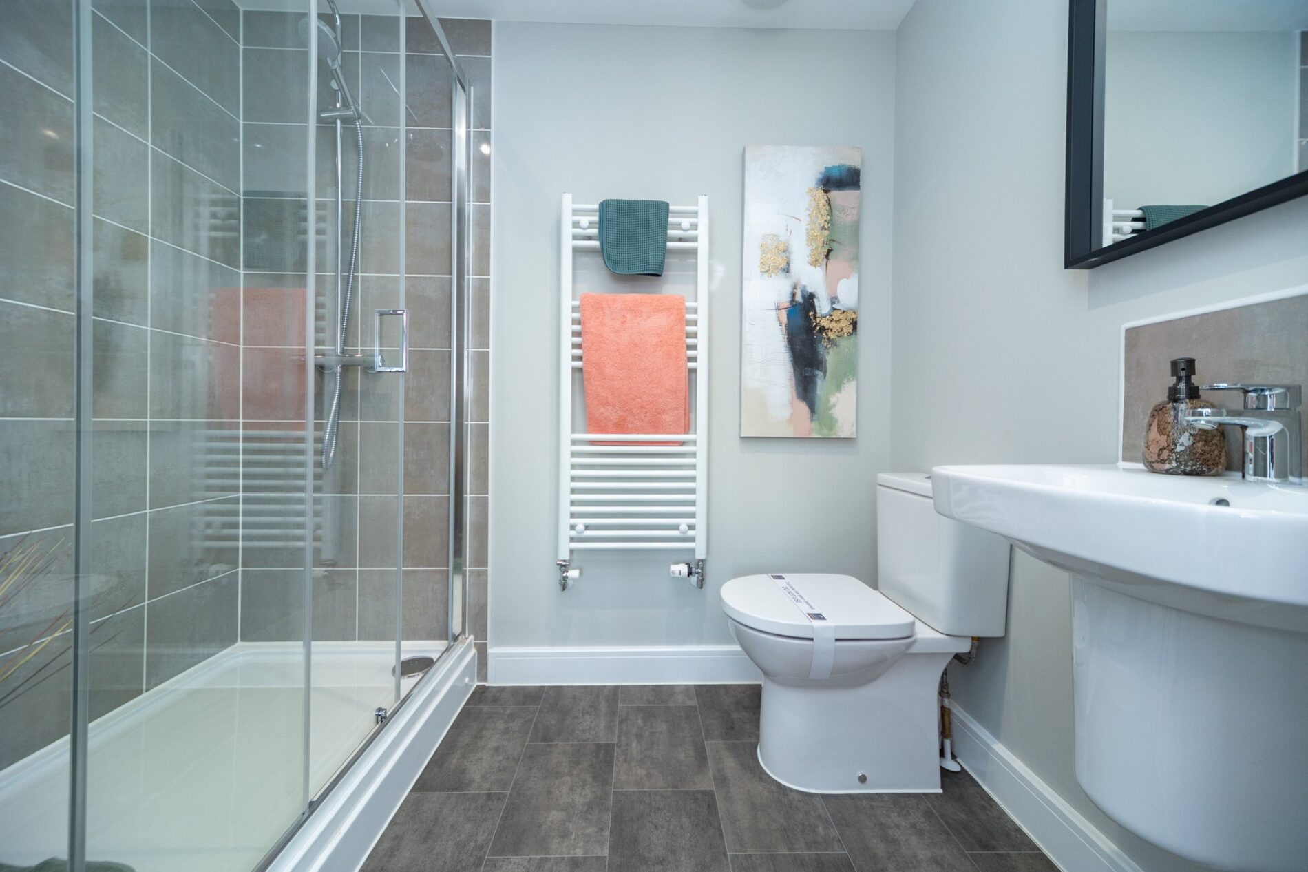 2.25m x 1.49m (7' 5" x 4' 11") With three piece suite comprising shower cubicle, wash-basin and close coupled WC plus towel radiator, ceiling lighting and extractor fan.