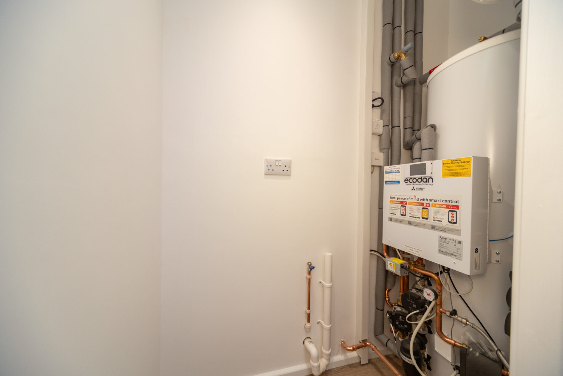 With ceiling light and space for washing machine and room above to add shelving. Also houses the properties hot water cylinder/vessels.