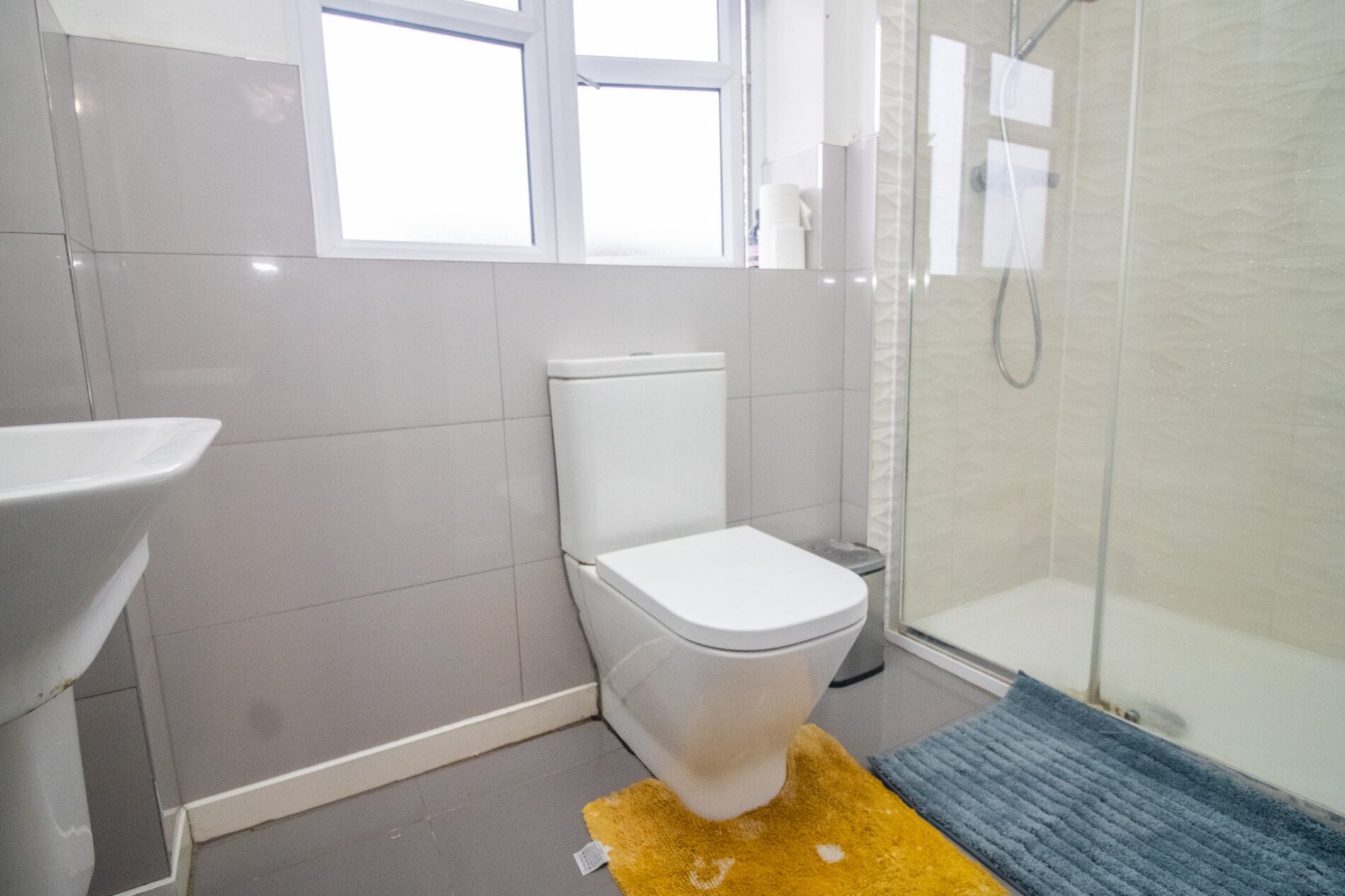 Three piece suite comprising walk in tiled shower cubicle, pedestal wash hand basin and low level WC, radiator, UPVC sealed double glazed window, tiled flooring and splash backs