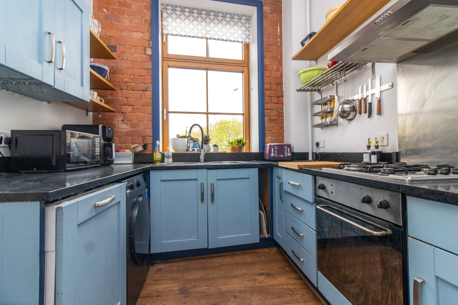 Comprising circular stainless steel drainer and sink with mixer tap over and cupboards under, matching base units with work surfaces over, drawers and cupboards, complementary wall mounted eye level cupboards, built in cooker and four piece gas hob with extractor fan over set in stainless steel hood with matching splash back, integrated fridge/freezer and dishwasher, hardwood sealed double glazed window.