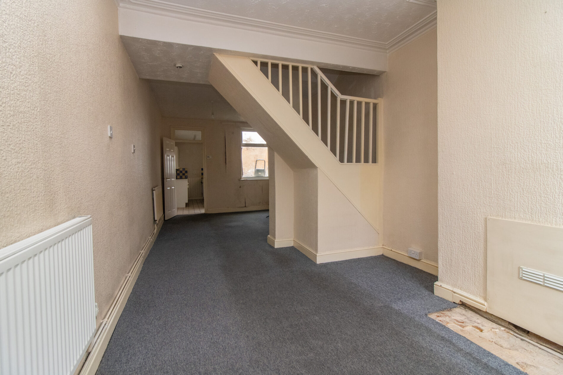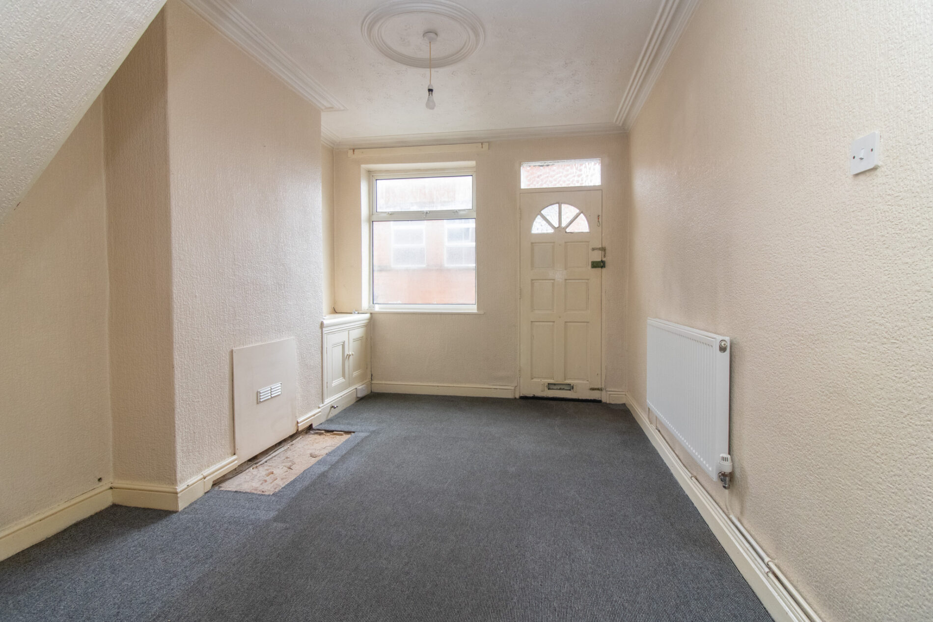 Radiator, UPVC sealed double glazed window, over stairs cupboard