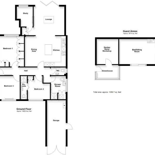 4.48m x 3.11m (14' 8" x 10' 2") The main annex space is a self contained bed/sitting space ideal for visiting family/friends with full kitchenette, lighting power and sliding patio doors to the garden a door leads off to a shower room (3.11m x 0.83m (10' 2" x 2' 9") with three piece suite. Situated within the building is a useful workshop/store (3.11m x 2.49m (10' 2" x 8' 2") which is accessed via the greenhouse.