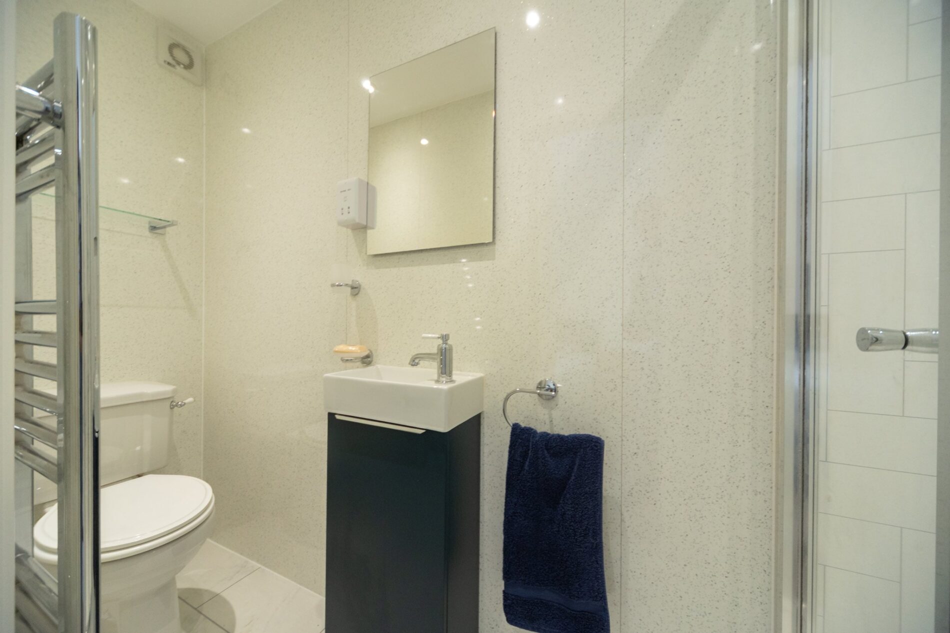 2.88m x .78m (9' 5" x 2' 7") With three piece suite comprising shower cubicle, WC and wash basin with storage as well as wall mirror, extractor fan, chrome finish towel radiator and tiled floor.