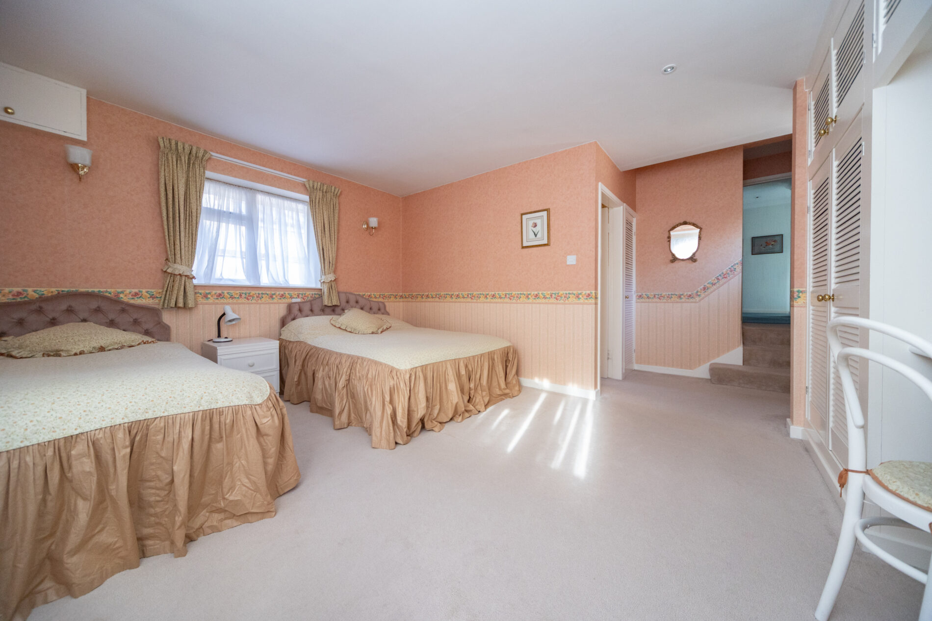 An impressive double room with windows front and rear plus french doors to the veranda, fitted storage, two radiators, wall lighting and access to: