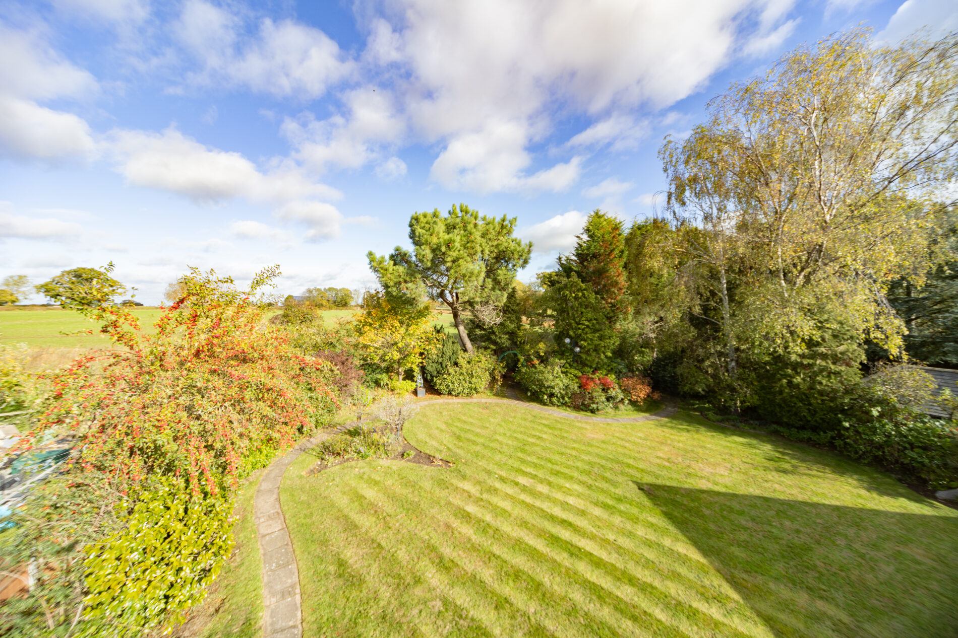 with mature planting, shrubs and trees set to bedding areas to the perimeter of the plot which abuts to farmland to the