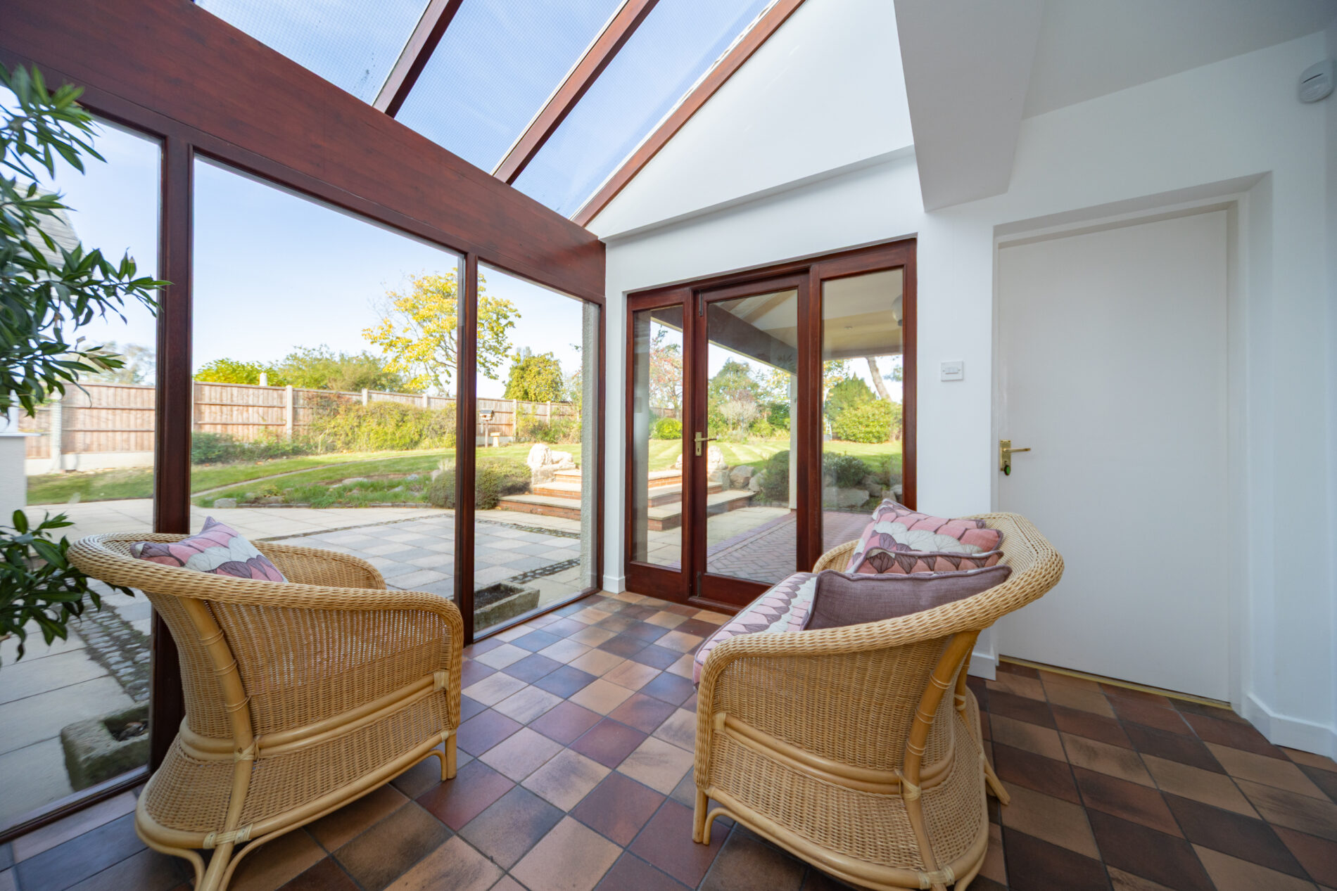 The hardwood conservatory has power points, wall lighting and french doors to both front and rear leading to the garden and to a useful side courtyard space which connects to the garage.