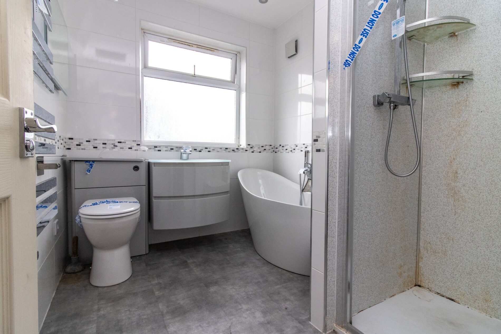 8' 2" x 6' 11" (2.49m x 2.11m) Four piece suite comprising easy wipe shower cubicle, free standing soaker bath with shower attachment, Vanity sink unit and low level WC, heated towel rail, UPVC sealed double glazed window