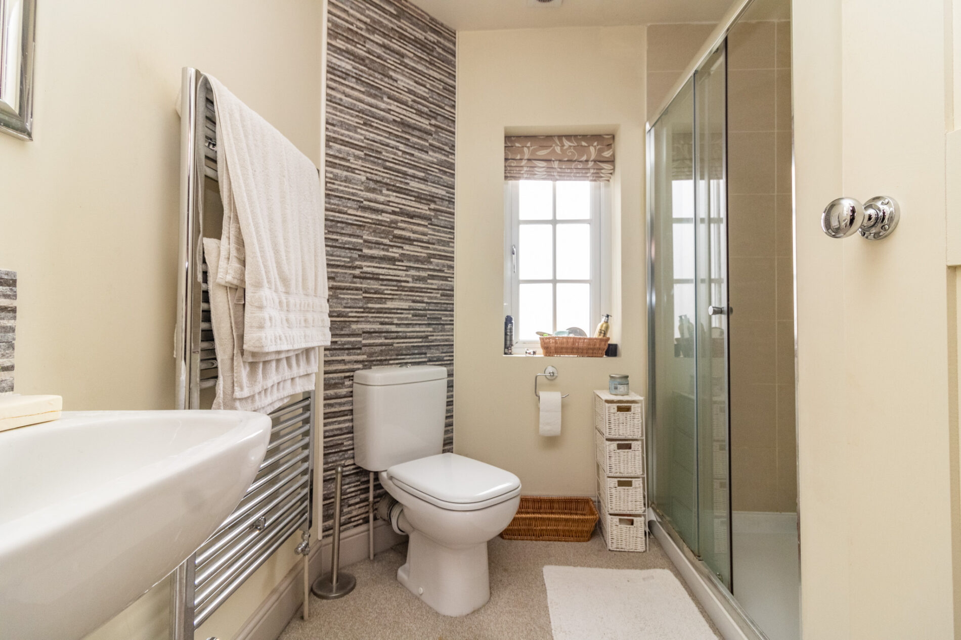 Three piece suite comprising panelled bath with shower over, pedestal wash hand basin and low level WC, large tiled splash backs, boiler cupboard, UPVC sealed double glazed window, heated towel rail.