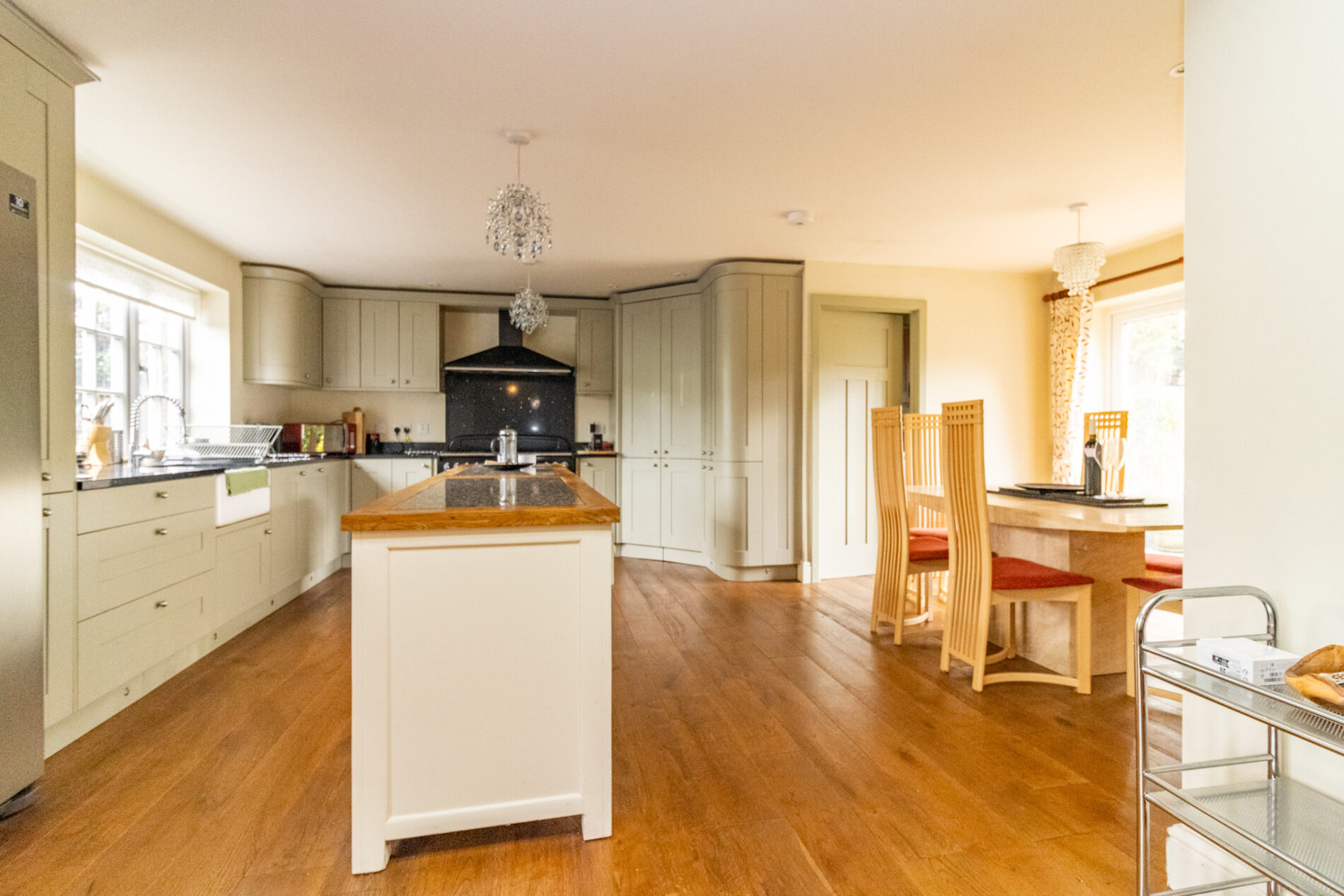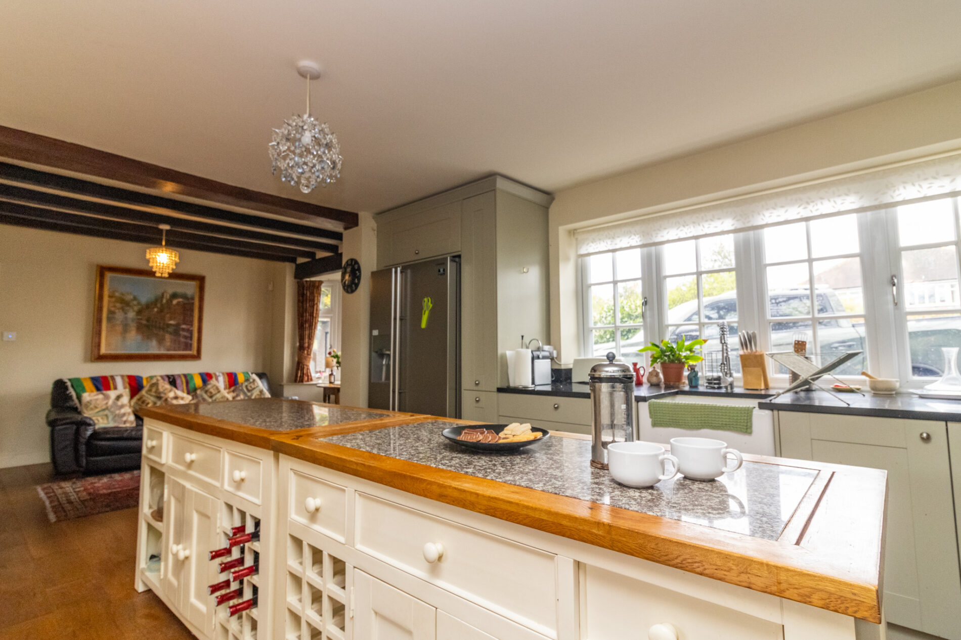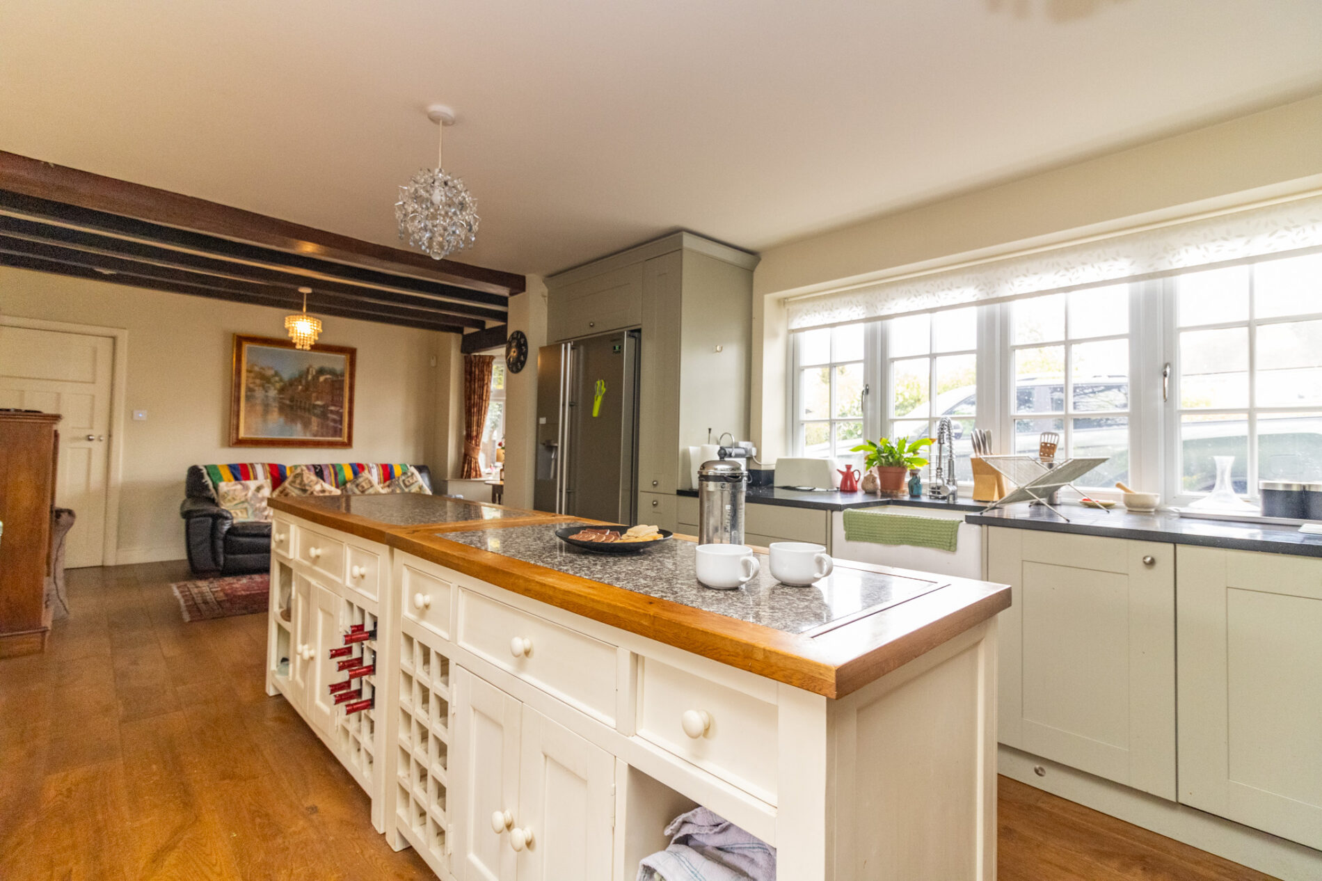 Incorporating a dining and sitting areas and a recently fitted in a range of cottage style units kitchen area comprising Belfast sink with mixer taps over, matching range of base units with Granite work surfaces over with matching upturn, drawers and cupboards under, complementary wall mounted eye level cupboards, large range cooker space with extractor fan over in display hood, feature central Island with Butcher block work surface and drawers, cupboards. shelving and wine racks under, fridge/freezer space, radiator, exposed beams, UPVC sealed double glazed windows, curved corner cupboards, UPVC sealed double glazed French door to rear garden, UPVC sealed double glazed window, UPVC sealed double glazed bay window.