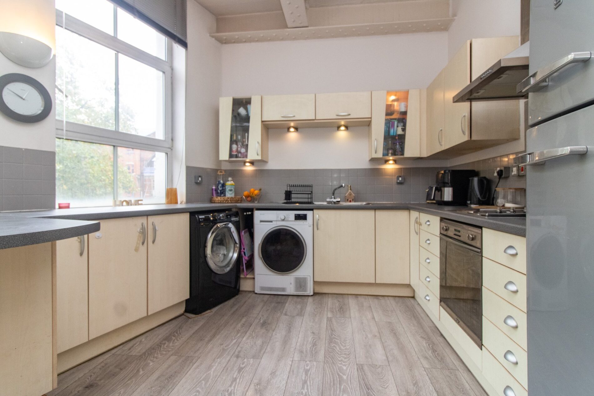 46' 11" x 18' 1" max (14.30m x 5.51m) Feature spacious area with high ceilings and original steelwork, electric heaters, tall sealed double glazed windows providing an abundance of natural light, nicely fitted kitchen area comprising sink unit with cupboards under, matching base units with work surfaces over, drawers and cupboards under, complementary wall mounted eye level cupboards, display glazed cabinets, tiled splash backs, breakfast bar, built in oven and four piece ceramic hob with extractor fan over set in stainless steel hood, fridge/freezer space, plumbing for washing machine. Archway leading to,