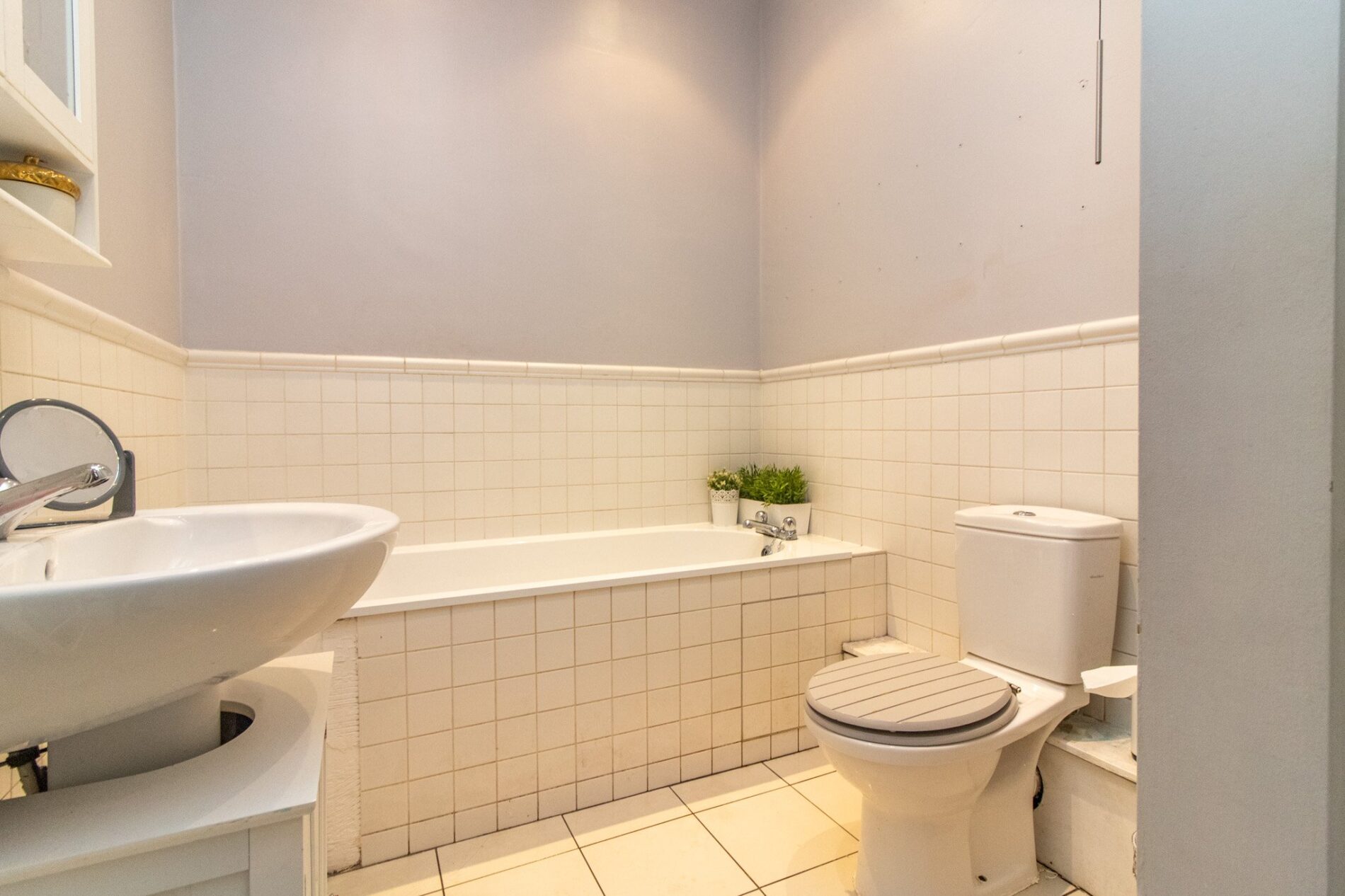 Four piece suite comprising walk in tiled shower cubicle, paneled bath, pedestal wash hand basin and low level WC, tiled splash backs, heated towel rail, airing cupboard.