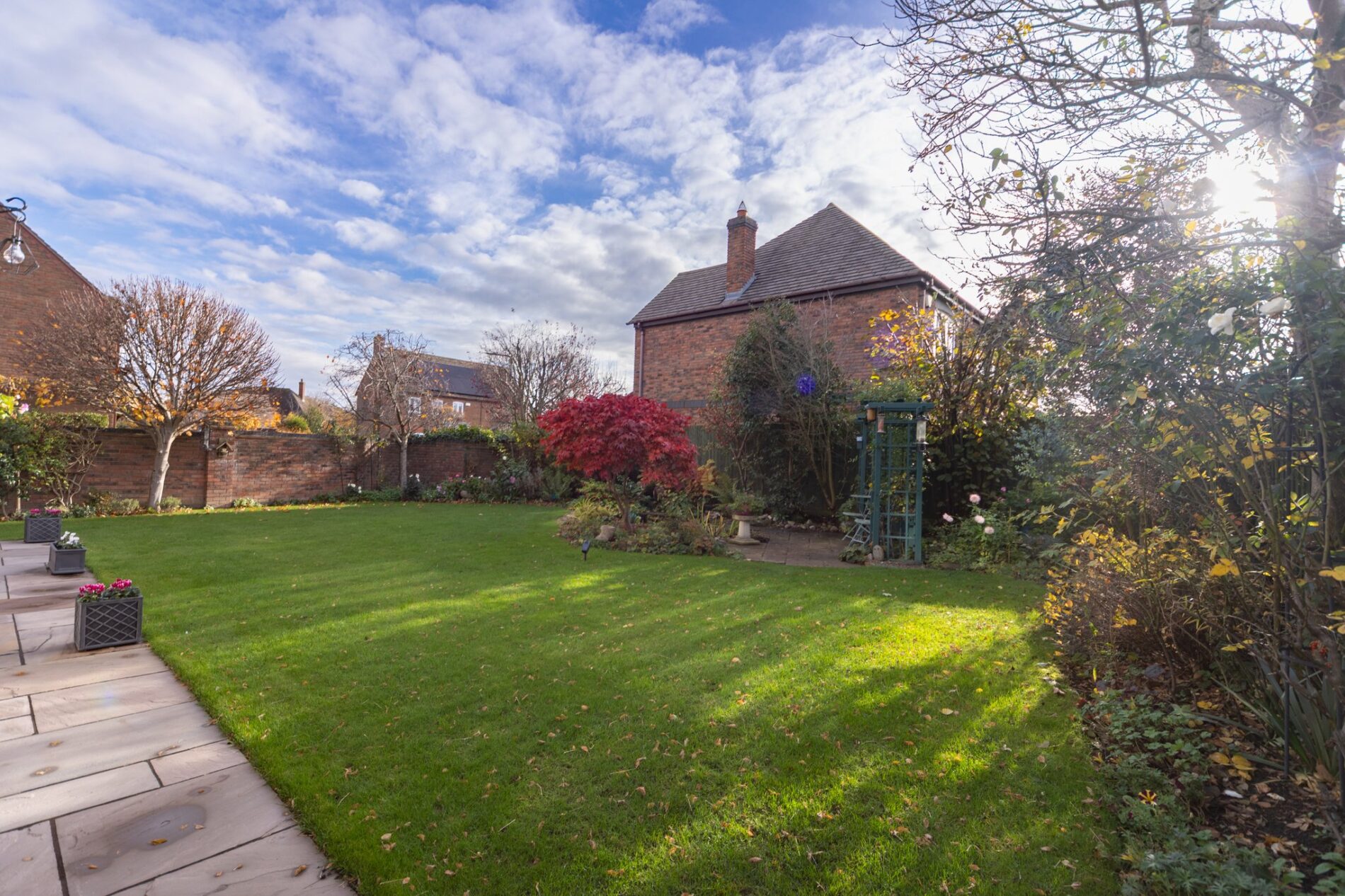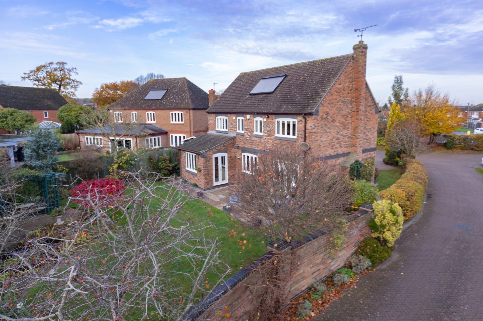 The property occupies an excellent overall plot with the frontage offering mature planting, natural stone paving and a driveway for four or five cars which leads to the detached garage. A gated access then leads to a side garden area with personnel door to the garage and also leads beyond to the rear garden.