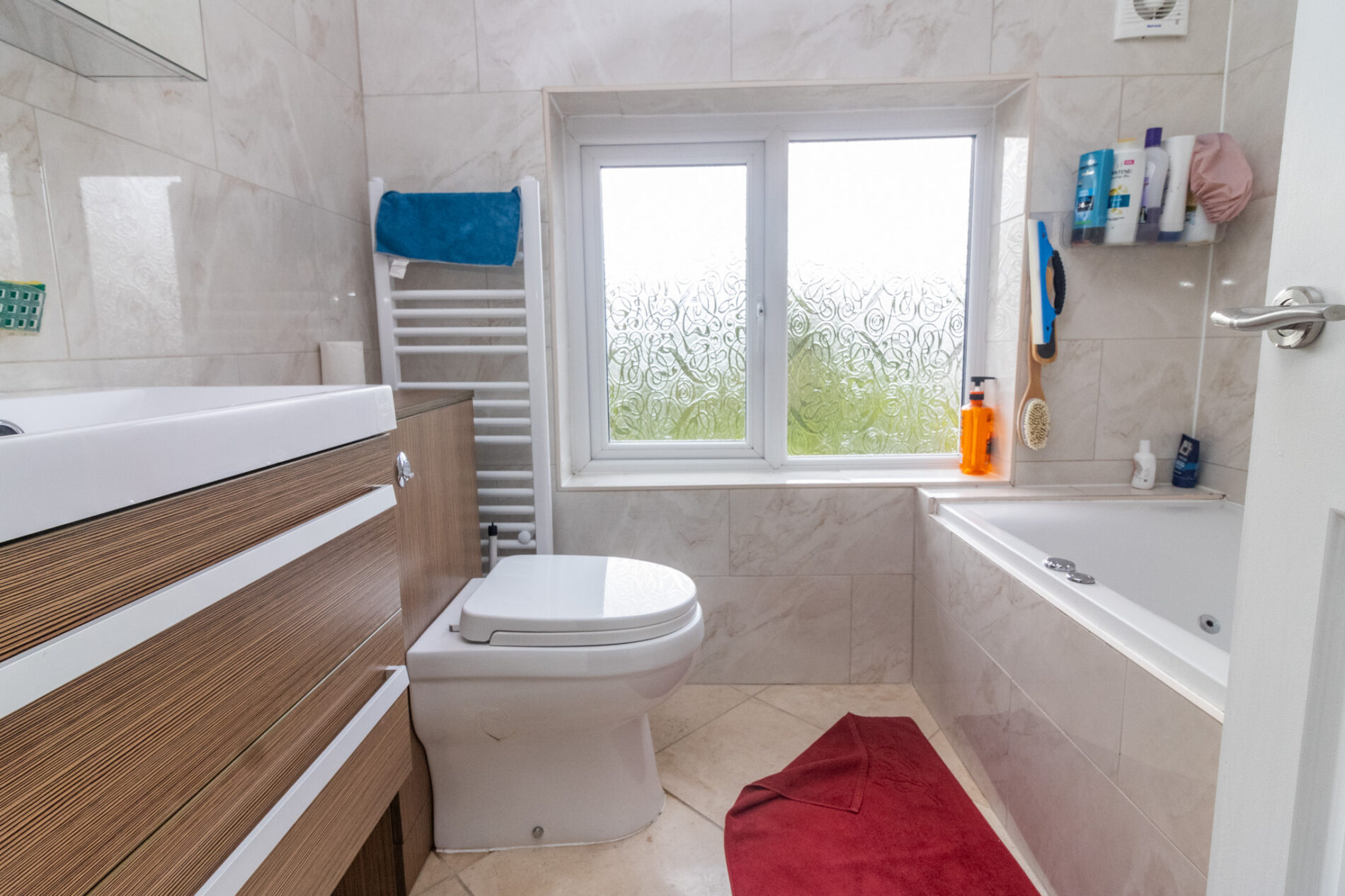 Three piece suite comprising Spa bath with shower over, Vanity sink unit and low level WC set in bathroom cabinet, UPVC sealed double glazed window, large tiled throughout, tiled flooring, spotlights, radiator.