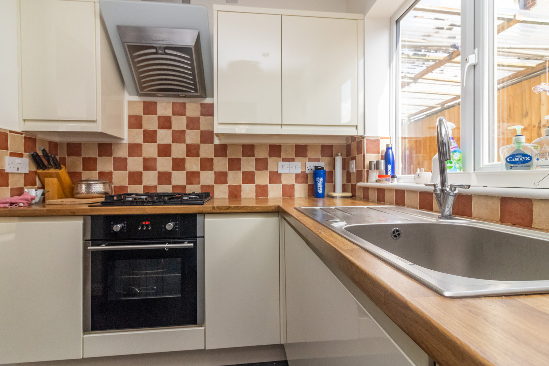 Fitted in a range of soft close units comprising single drainer sink unit with cupboards under, matching base units with Butcher block work surfaces over, deep pan drawers and cupboards under, complementary wall mounted eye level cupboards, built in oven and four piece gas hob with angled extractor fan over, UPVC sealed double glazed window, spotlights, tiled splash backs.