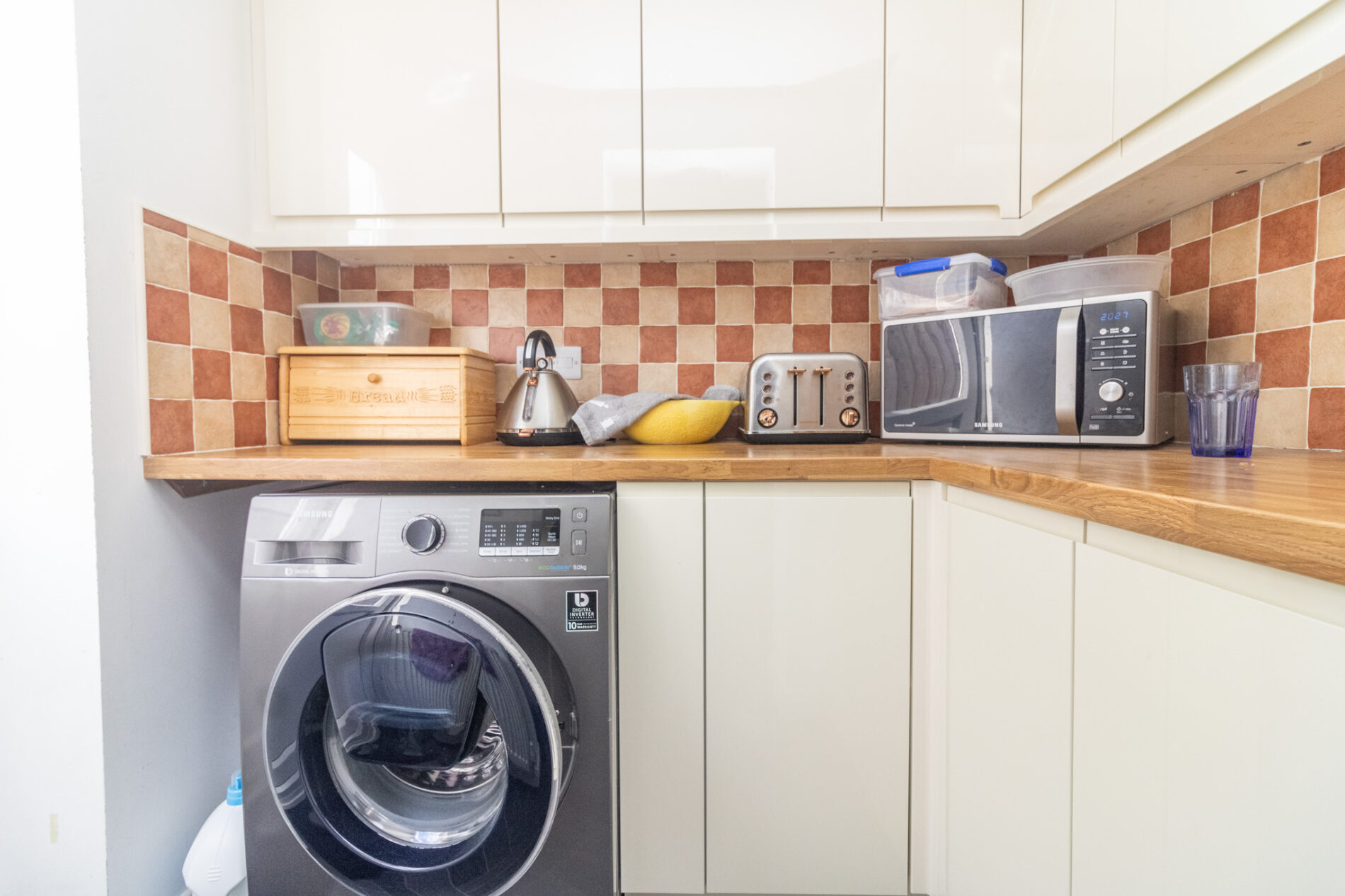 Butcher block work surfaces with soft close cupboards and utility space with plumbing for washing machine under, complementary wall mounted eye level cupboards, tiled splash backs, sealed double glazed door to rear garden.
