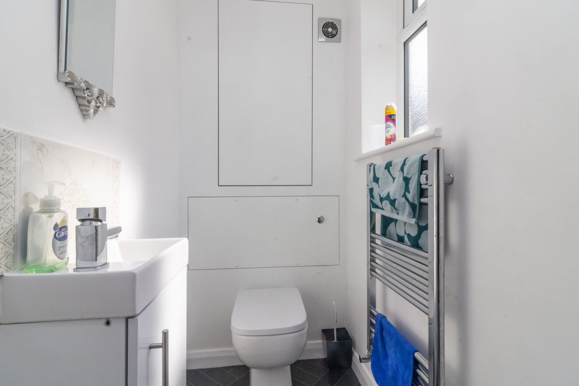 Low level WC and Vanity sink unit, heated towel rail, UPVC sealed double glazed window, spotlights.