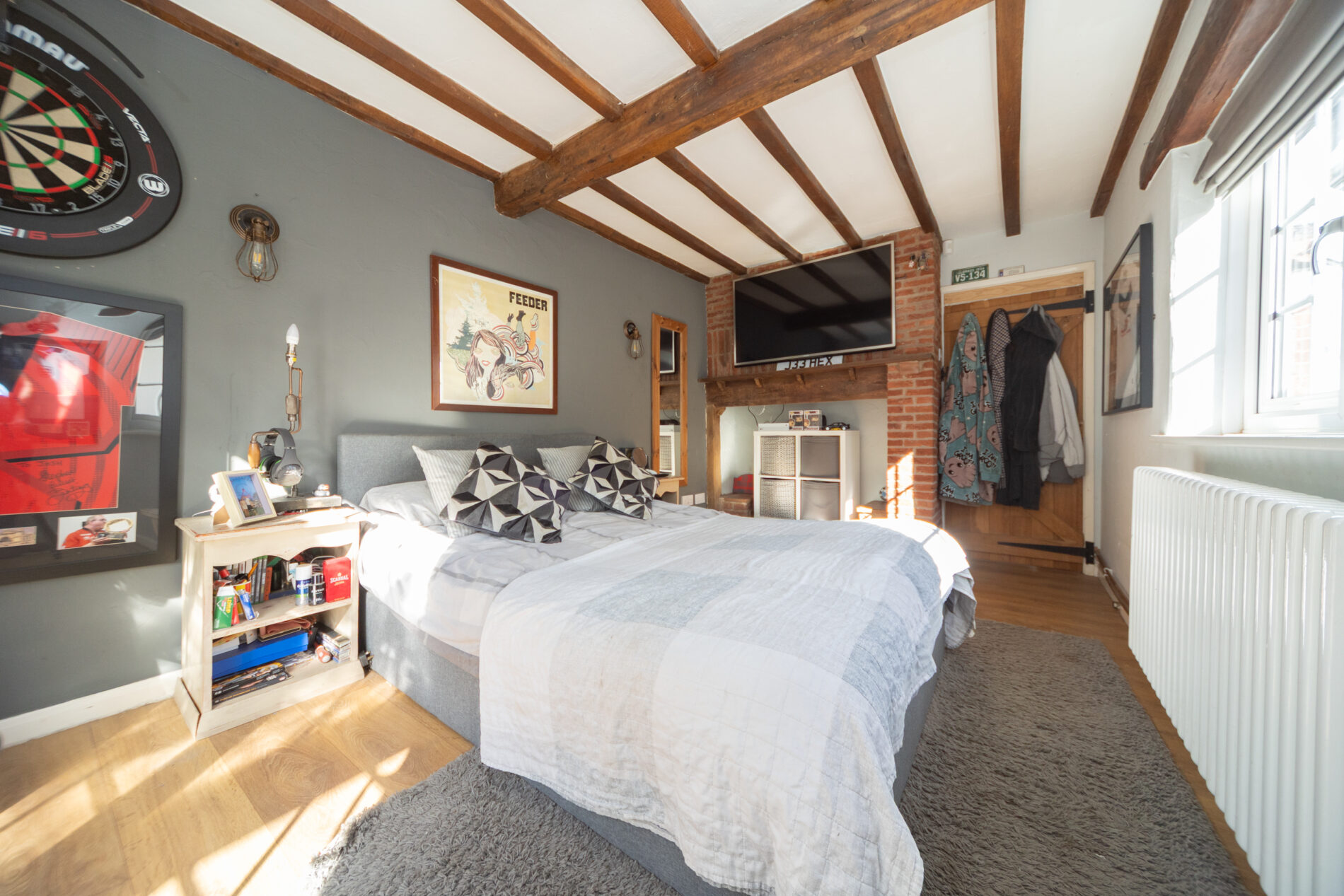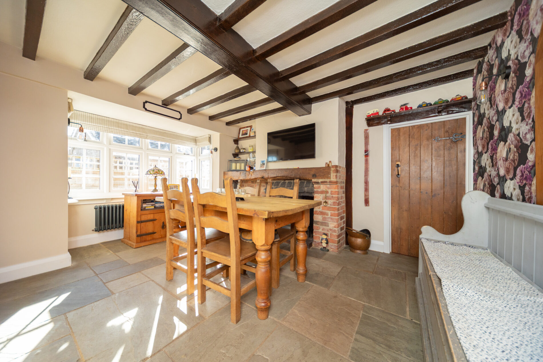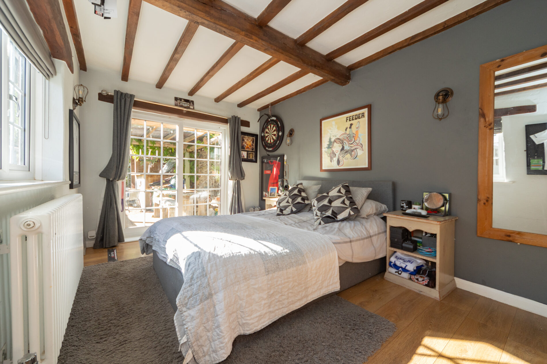 A flexible space ideal as a third reception space or, as currently a fourth bedroom. Having a dual aspect with multi-paned casement window to side and rear patio doors to the garden, feature fireplace with oak mantle-beam, decorative ceiling beams, wall light points and radiator.
