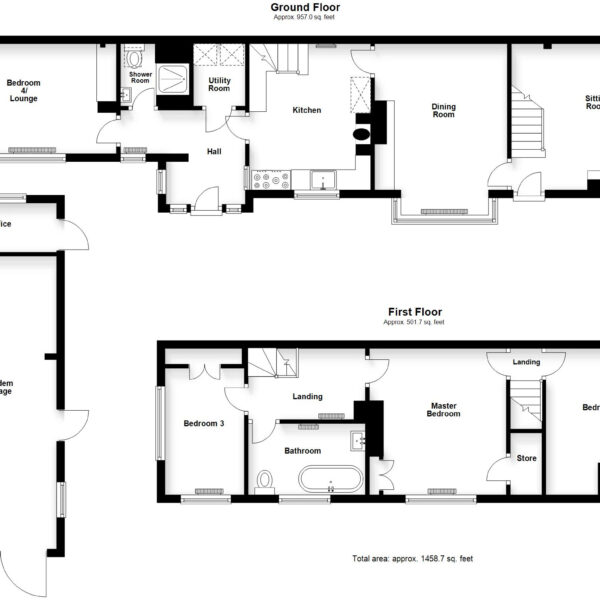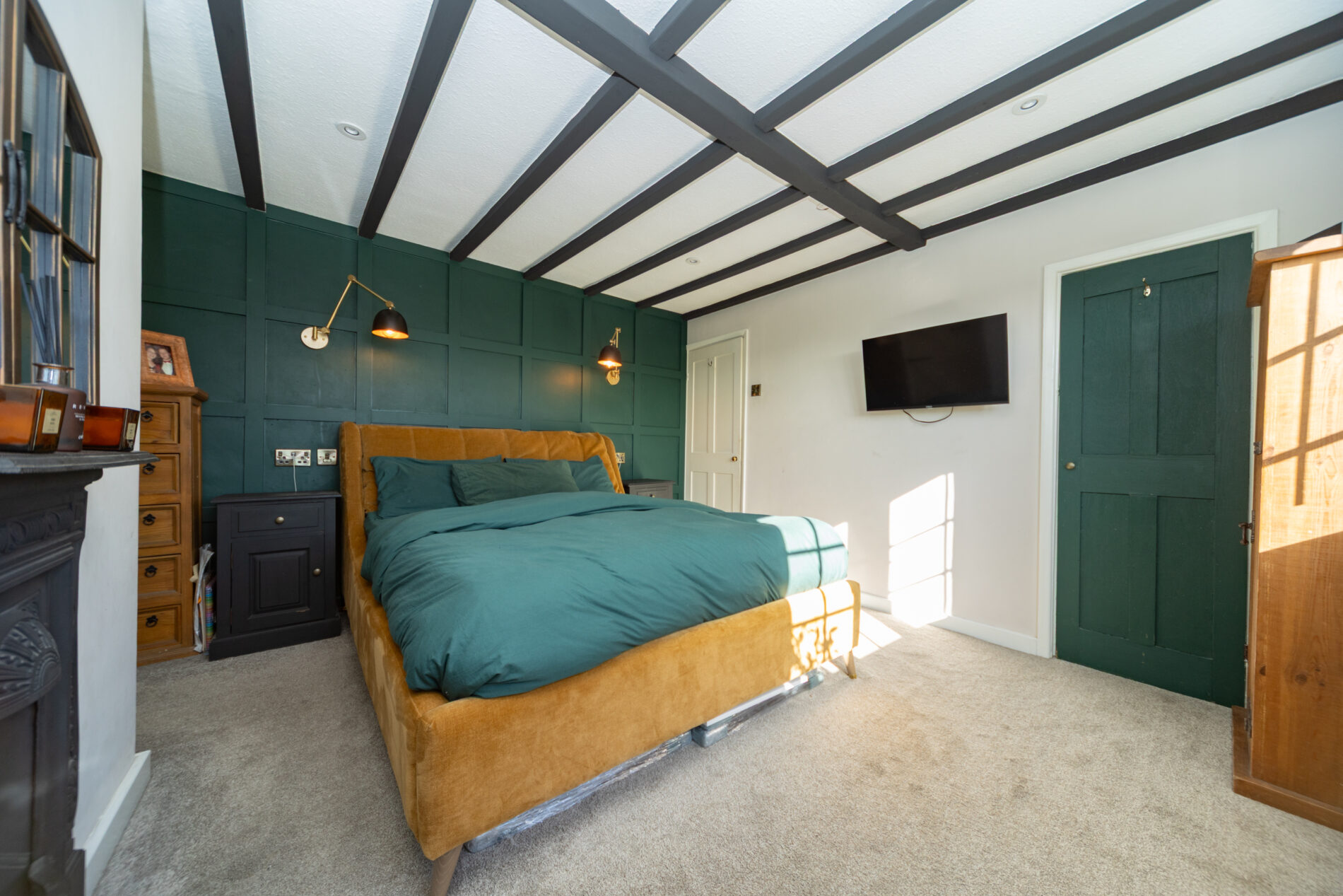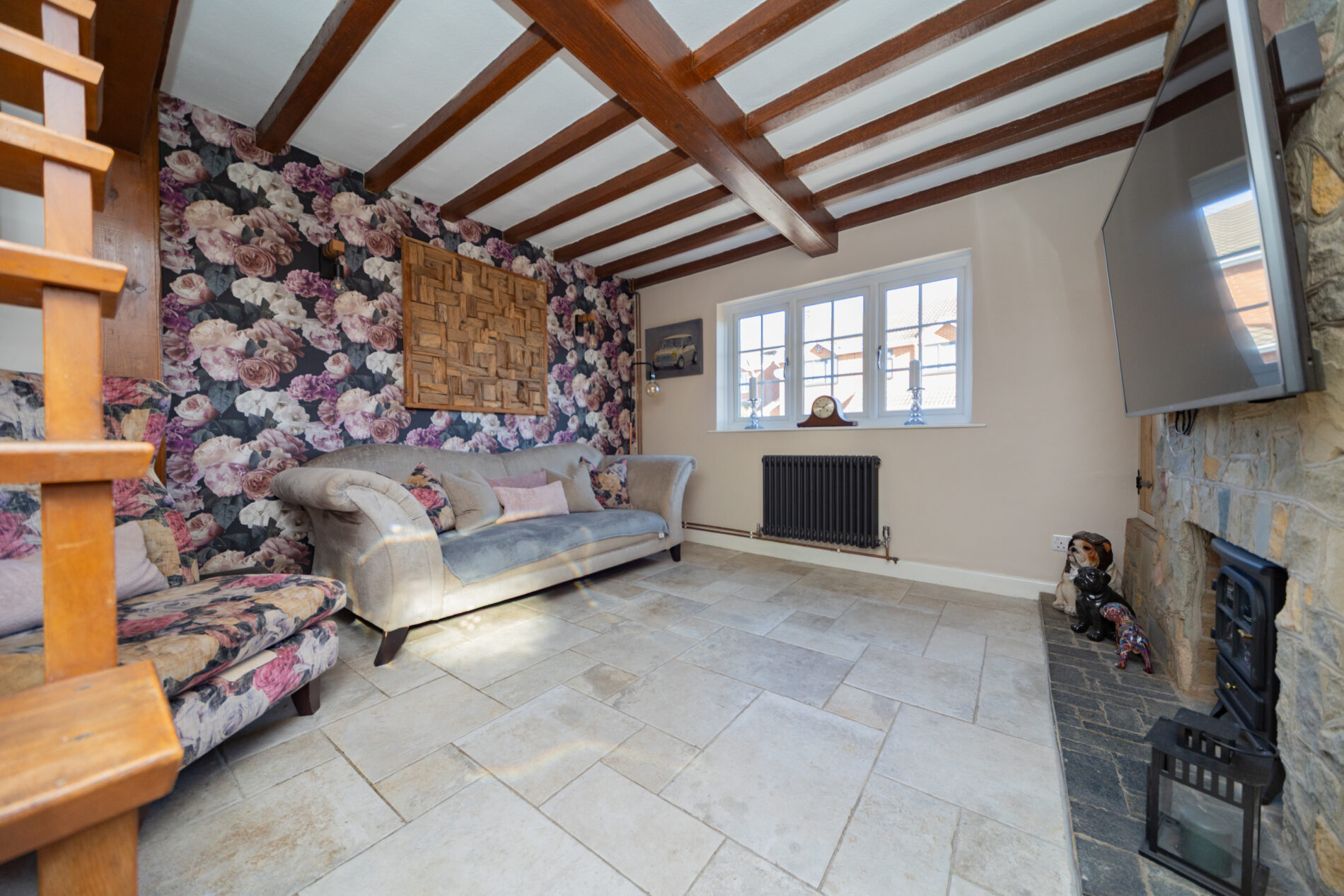 A flexible space ideal as a third reception space or, as currently a fourth bedroom. Having a dual aspect with multi-paned casement window to side and rear patio doors to the garden, feature fireplace with oak mantle-beam, decorative ceiling beams, wall light points and radiator.