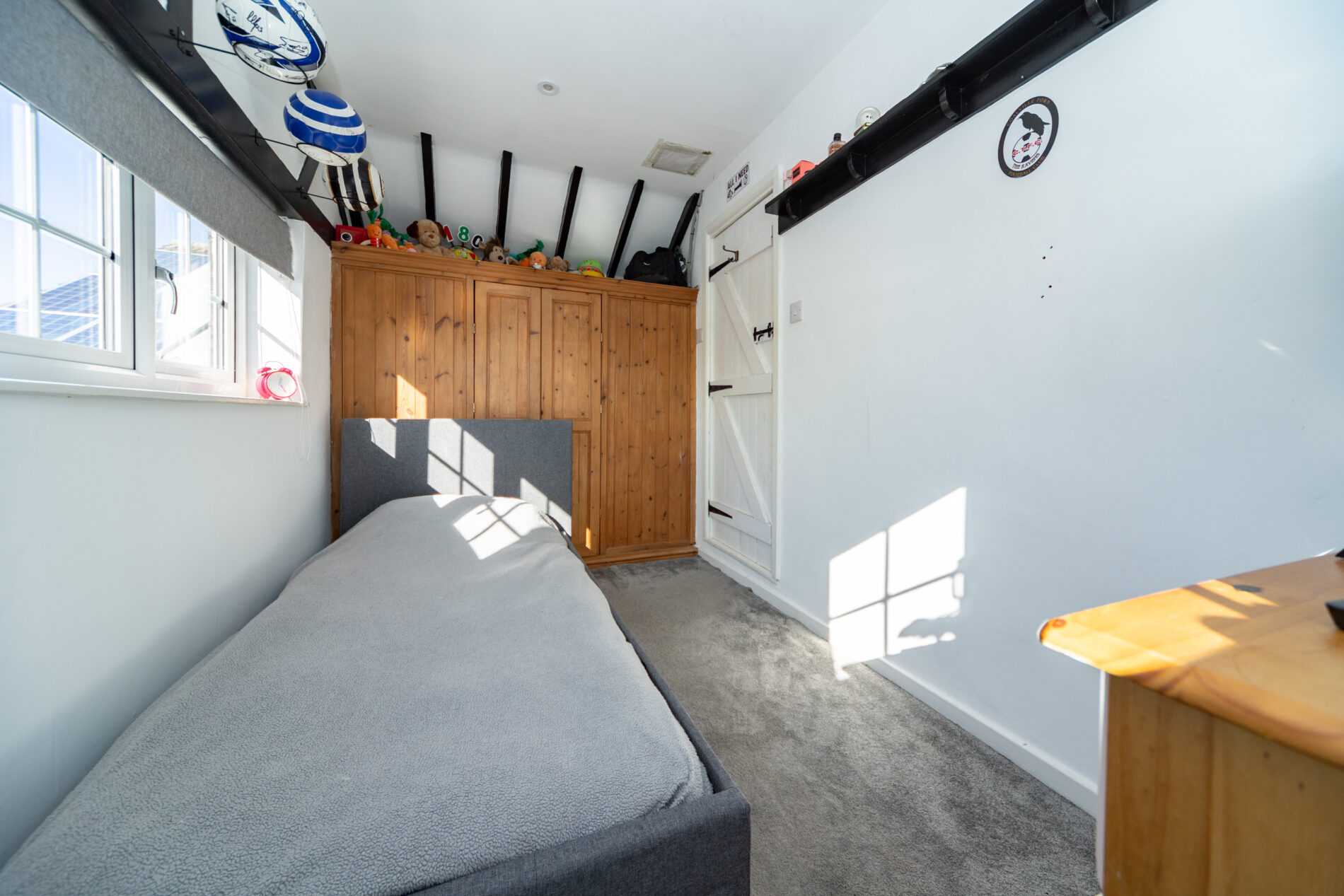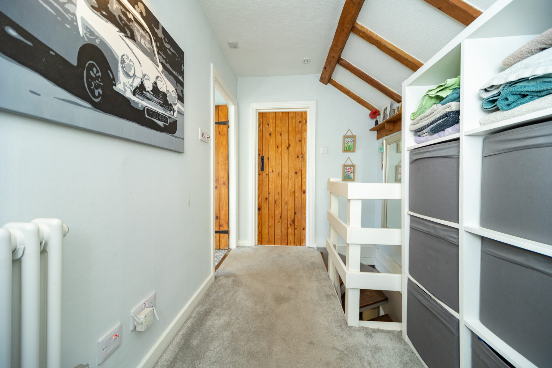 Having a dual aspect with double glazed windows to the property's side and rear, radiator, built-in cupboard space which spans the entire side wall, exposed beams.